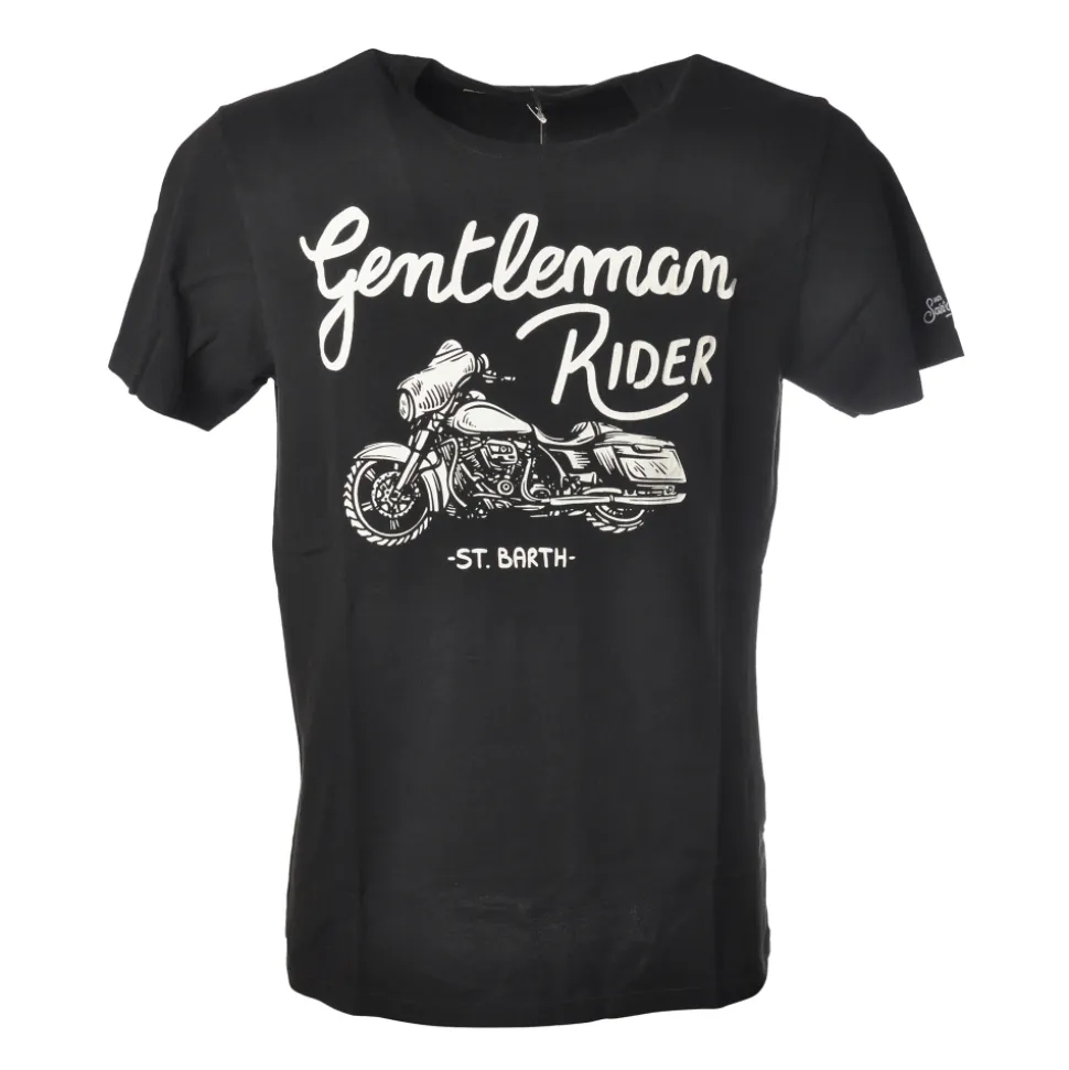 Crew-neck T-Shirt, short sleeves, with Motorcycle print on the front and contrasting white “Gentleman Rider” writing, Saint Barth.