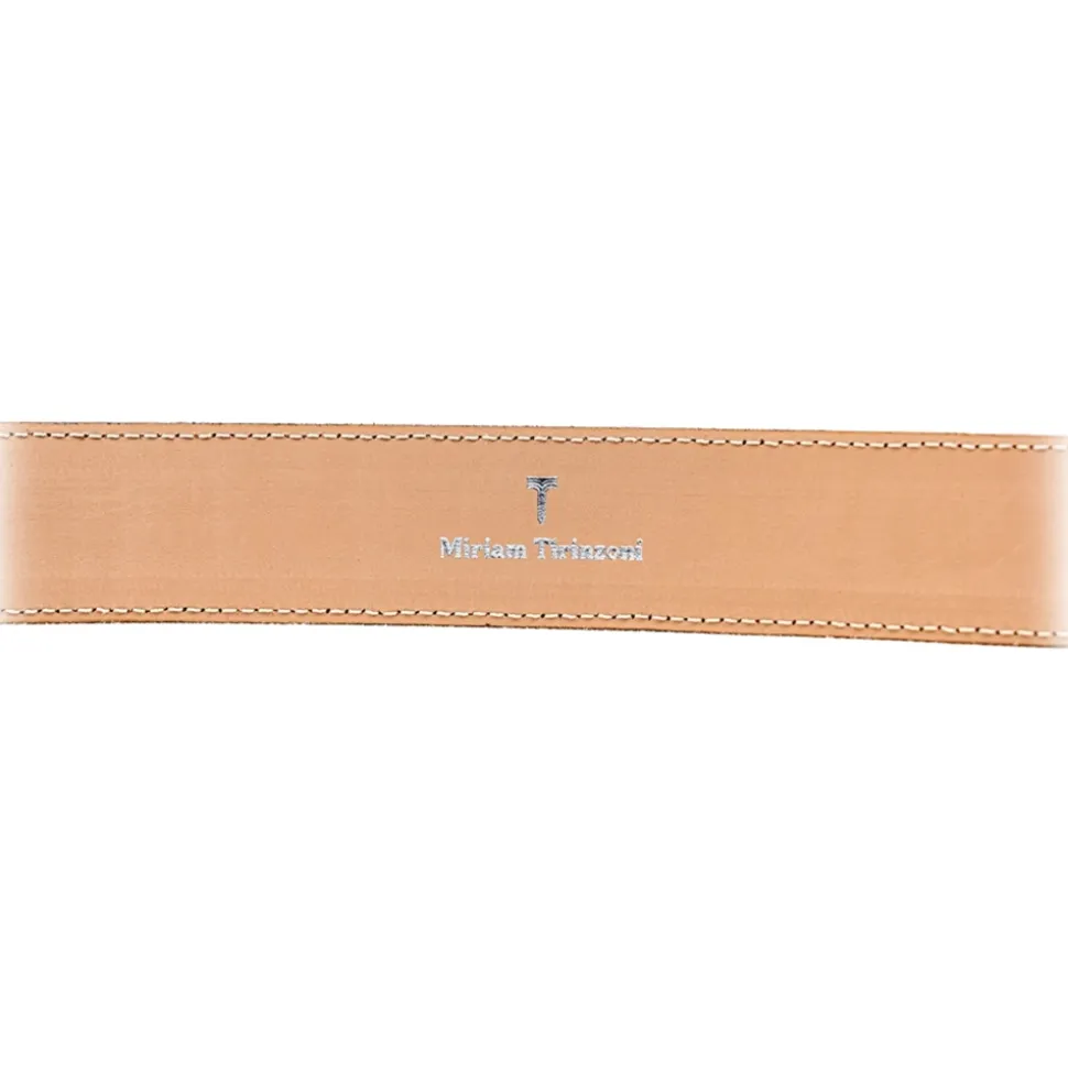 Brown eel leather belt with a silver buckle featuring the Miriam Tirinzoni logo. The size is adjustable, with clips, and it has a height of 40 mm.