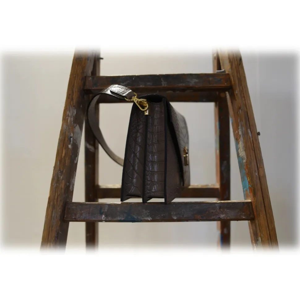 Material: Made with genuine brown crocodile-print calfskin.