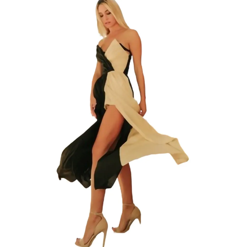 This is a long bicolor dress made from 100% silk in black and white. It features a wide slit, adding an elegant touch to the dress. The draping is a distinctive feature of the gown, enhancing its overall design.