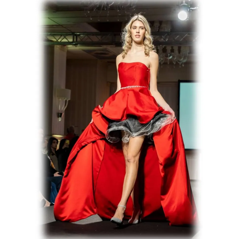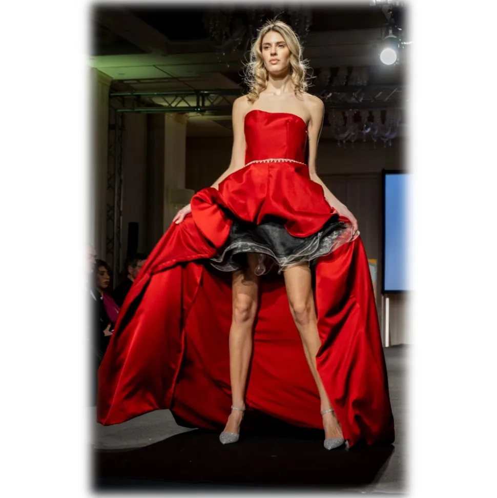 Elegant dress in red fabric, made as a unique piece, size 42, with a wide skirt and a train measuring 1.5 meters. It features an under skirt made of organza in grey and black.