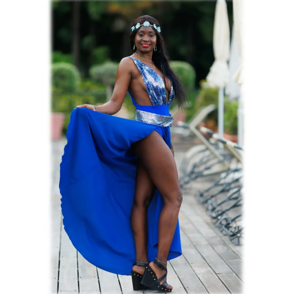 Miriam Tirinzoni – Tailored Swimsuit in Blue Sequins with a Coordinated Silk Skirt – Swimwear – Luxury Exclusive Collection