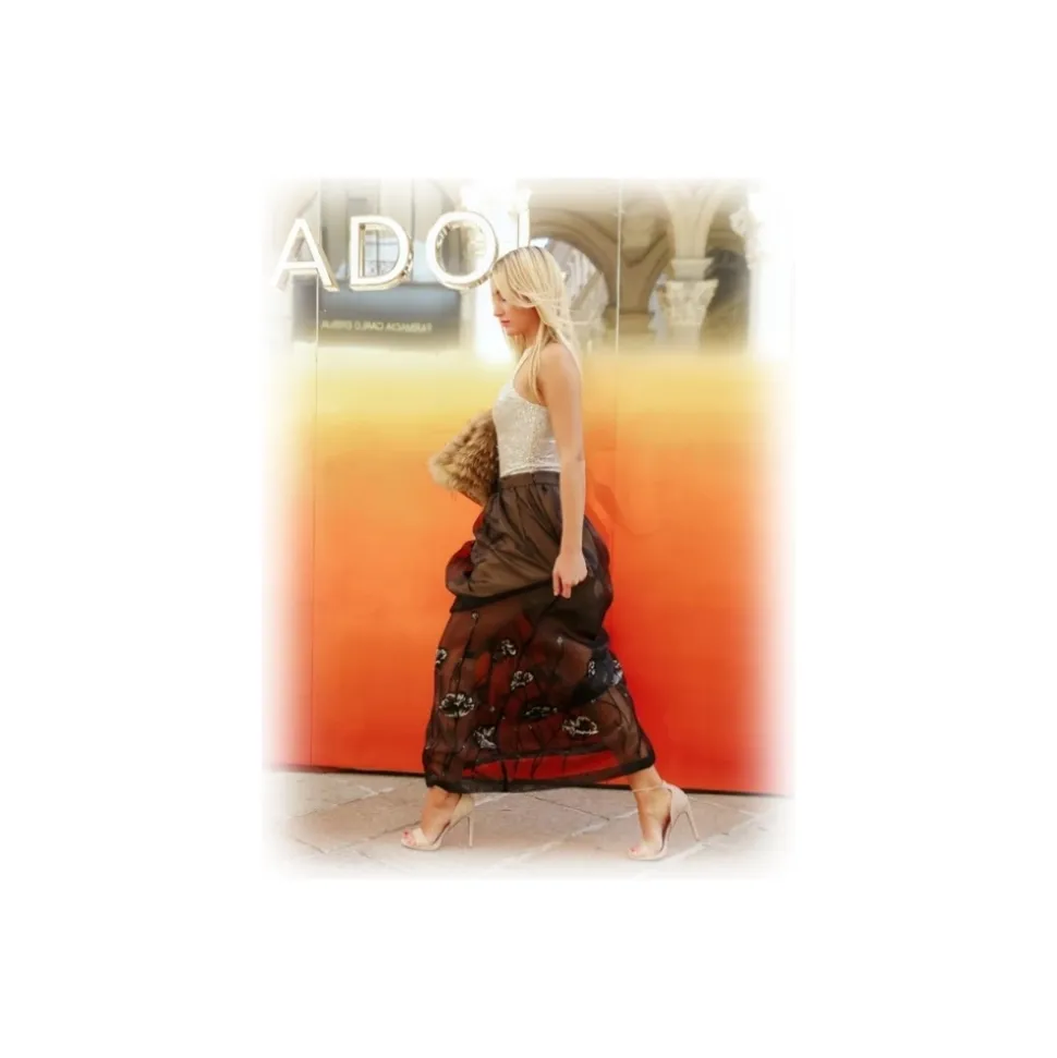 Elegant skirt made of black tulle featuring particular floral motifs.