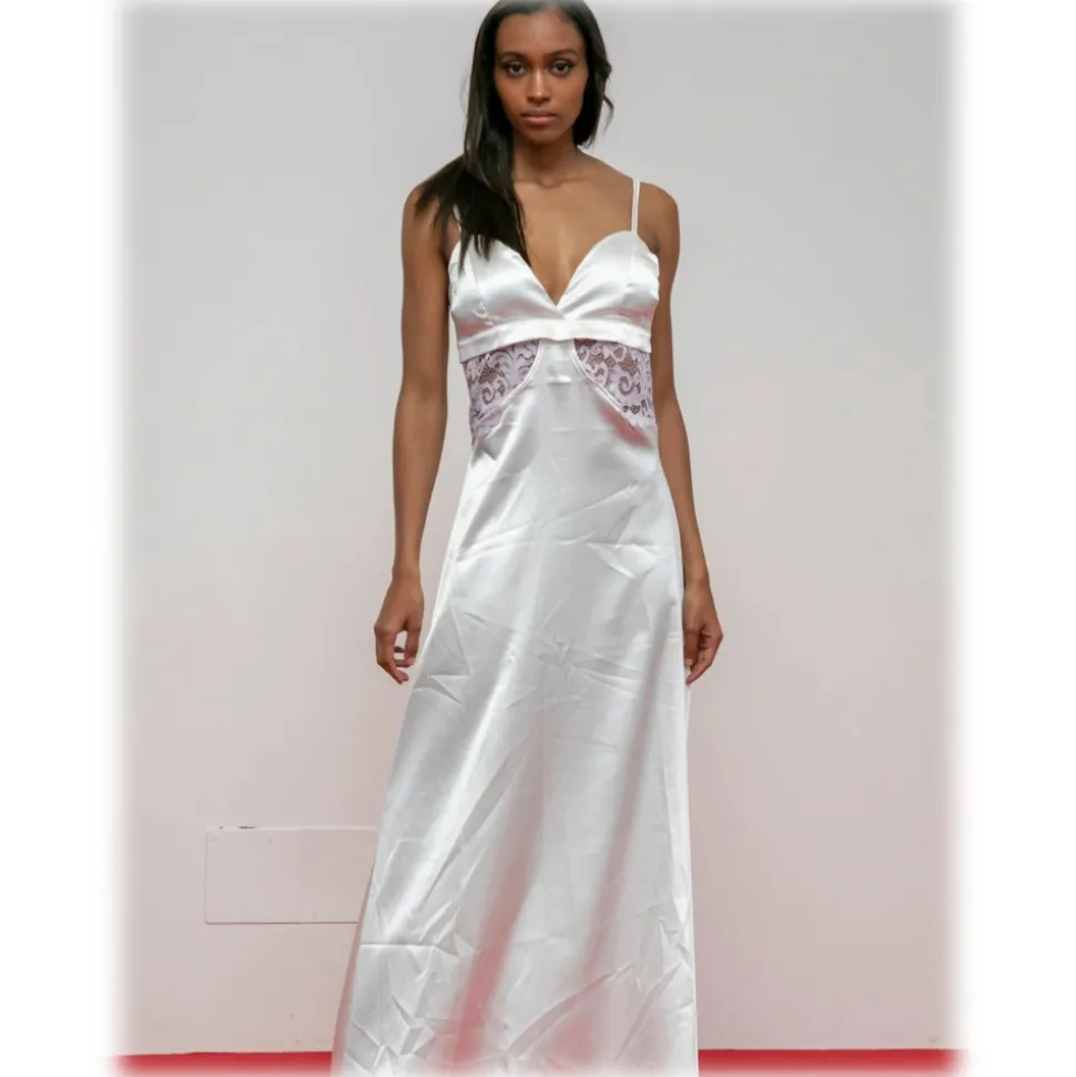 Long white dress with lilac lace details. Made entirely with Italy fabrics.