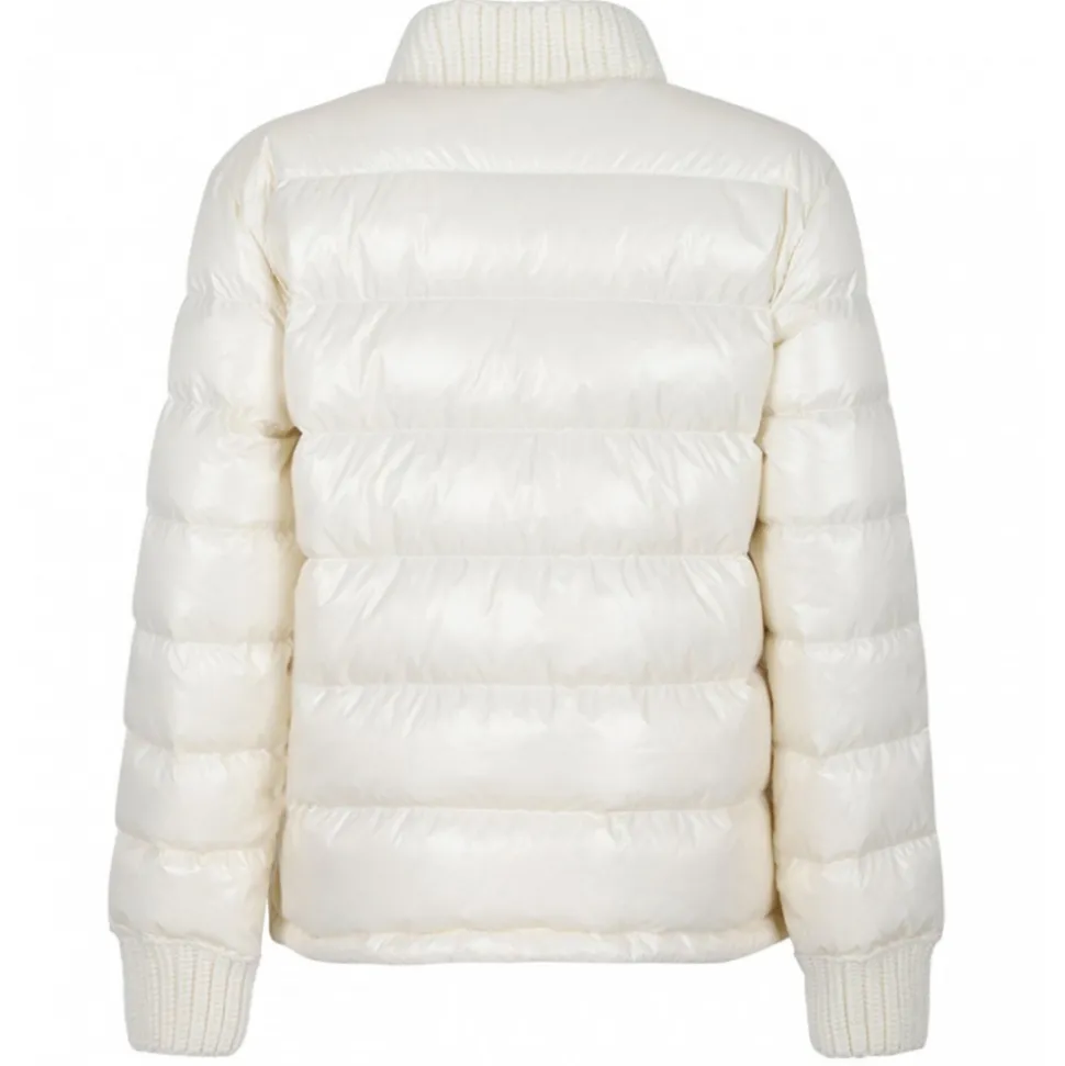 Moncler White Arcelot Short Down Jacket. Outer crafted in white laqué tech fabric with a feather padding. Ribbed high neck, long sleeves, ribbed cuffs, front zip fastening, two front patch pockets with ribbed details, Moncler logo patch, straight hem.