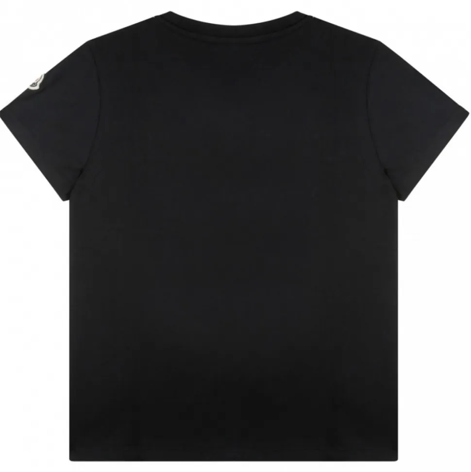 Moncler Kids Black Logo Print T-Shirt. Black cotton t-shirt, crew neck, short sleeves, front logo print, logo patch to the sleeve.