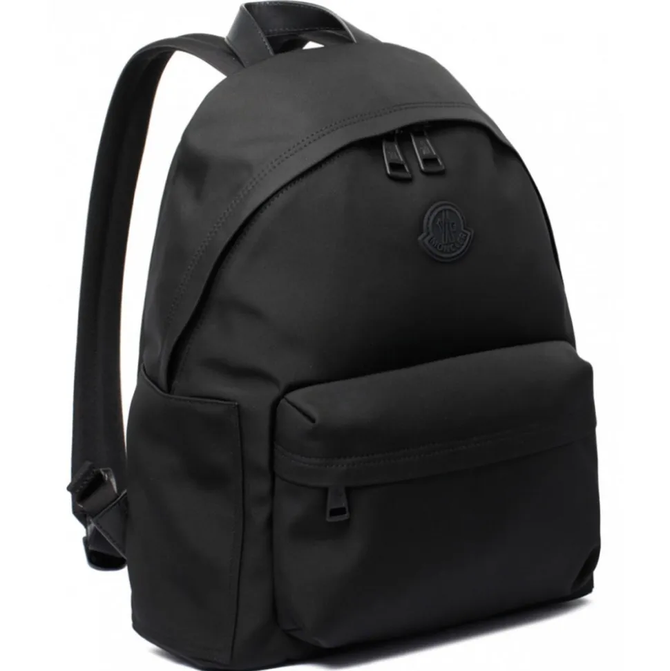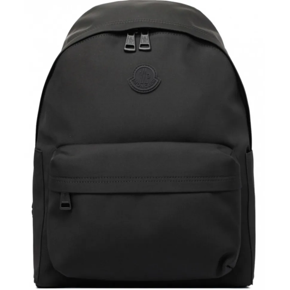 Monlcer Black New Pierrick Backpack. Black nylon backpack, logo patch to the front, single top handle. Two adjustable shoulder straps, two-way zip fastening, main compartment and front zip-fastening pocket.