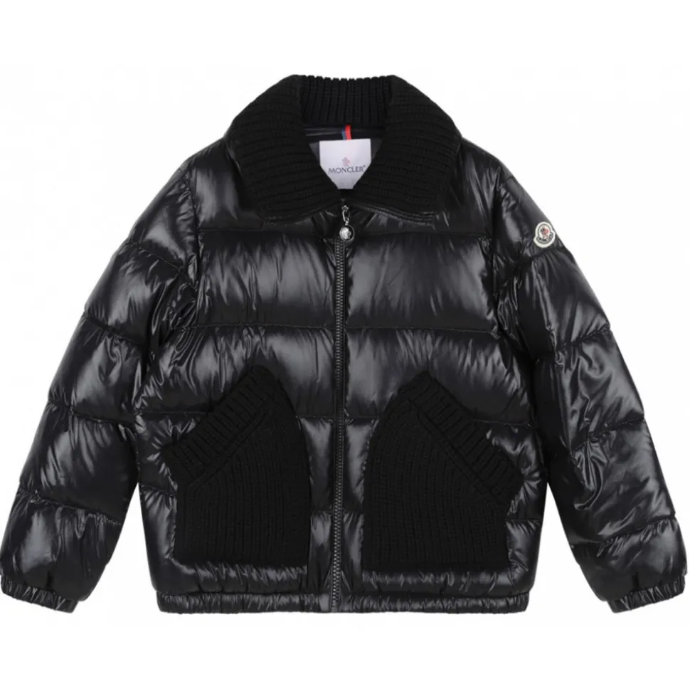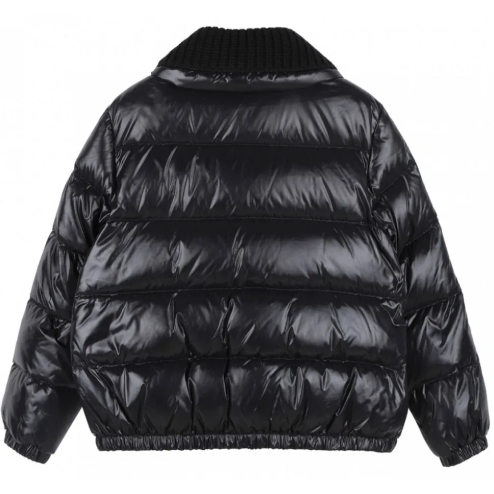 Moncler Enfant Black Puffer Jacket. Black padded design jacket, down-feather filling, quilted and metallic sheen. Knitted panels, logo patch at the sleeve, funnel neck and front zip fastening. Branded zip puller, long sleeves, elasticated cuffs, two side pouch pockets and elasticated hem.