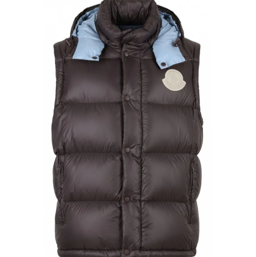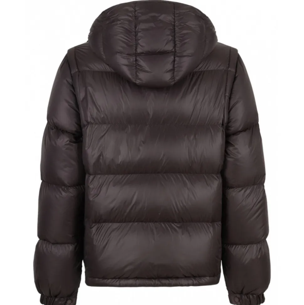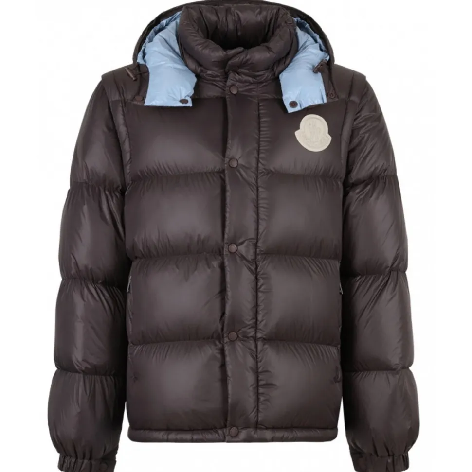 Moncler Brown Cyclone Padded Jacket. Brown texture finish jacket, padded design, goose down blend. Quilted, detachable hood, detachable sleeves, elasticated cuffs. Applique logo, two side zip fastening pockets, straight hem, front press stud fastening, concealed front zip fastening.