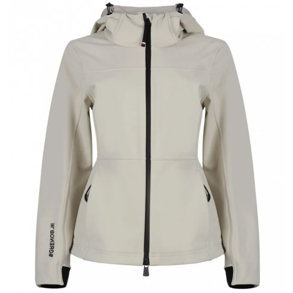 Moncler Grenoble Zumeles Jacket. Light beige jacket, model with djustable hood with drawstring, double-slider zip fastening on the front, two side welt pockets, iconic brand logo patch applied on the left sleeve, monochrome pattern, regular fit.