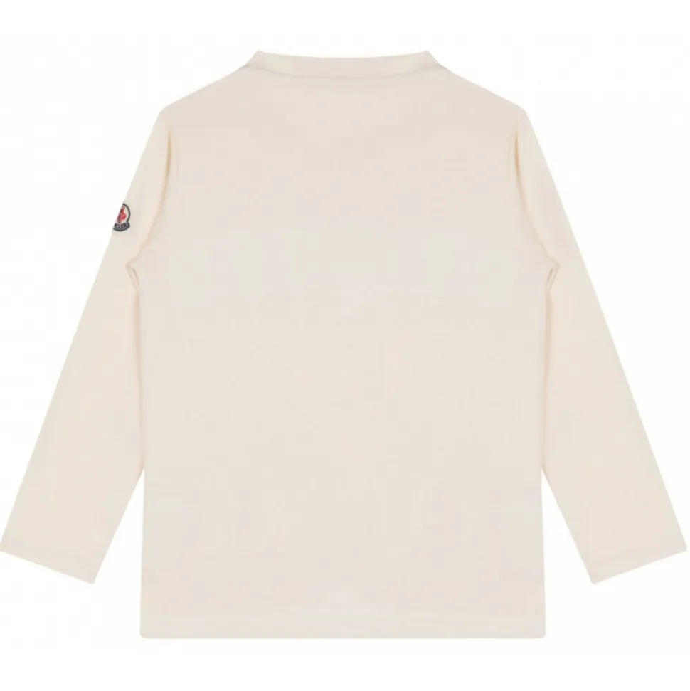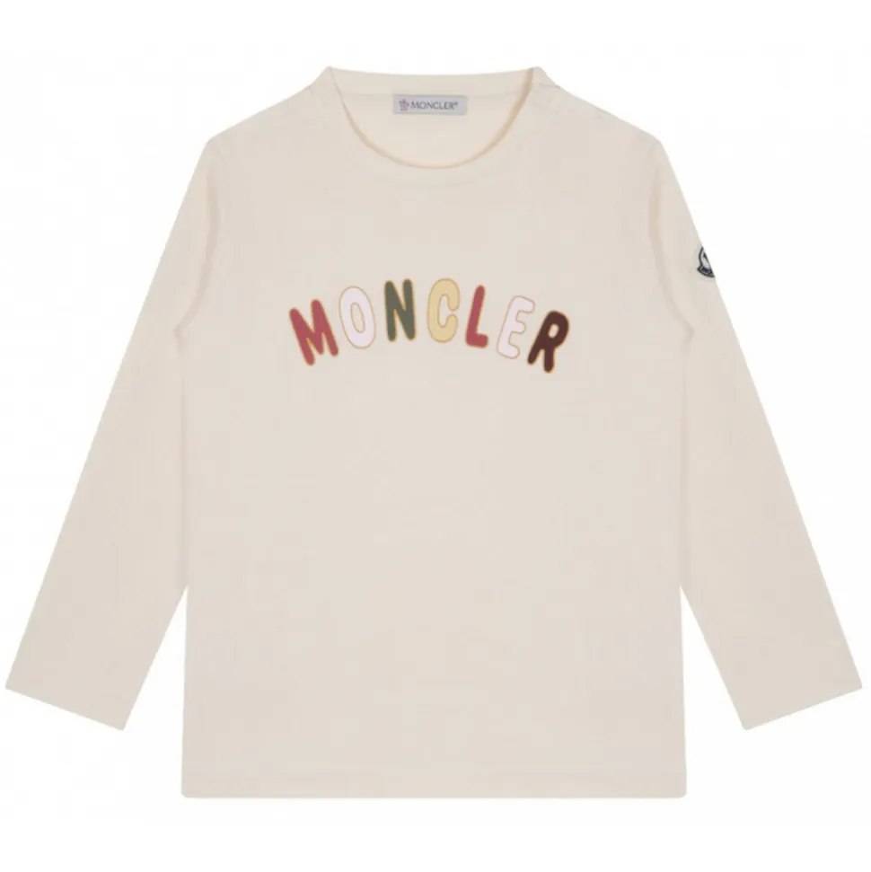Moncler Enfant White Logo Print T-Shirt. White crew neck t-shirt, long sleeves, press stud fastening at the shoulder. Logo print to the front, logo patch at the sleeve, straight hem.