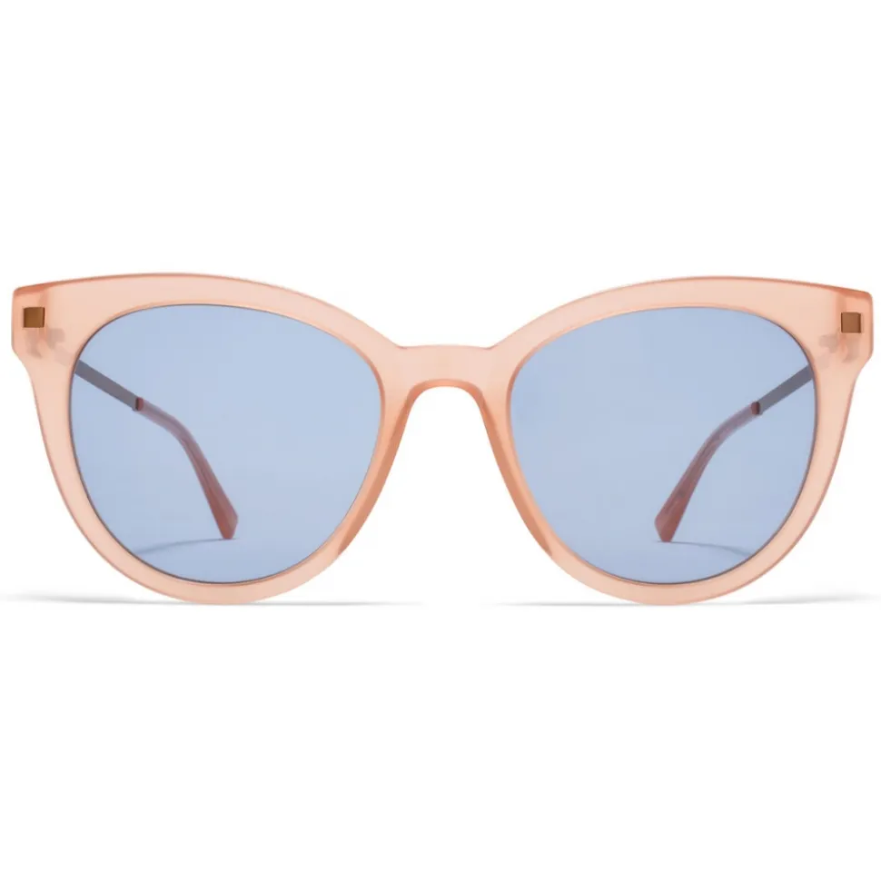 Made of lightweight stainless steel and slender acetate, ANIK in C46 Rhubarb Sorbet/Shiny Copper with Sky Blue Solid lenses is a panto-shaped sunglass frame from the MYKITA LITE ACETATE collection. Handcrafted in Berlin.