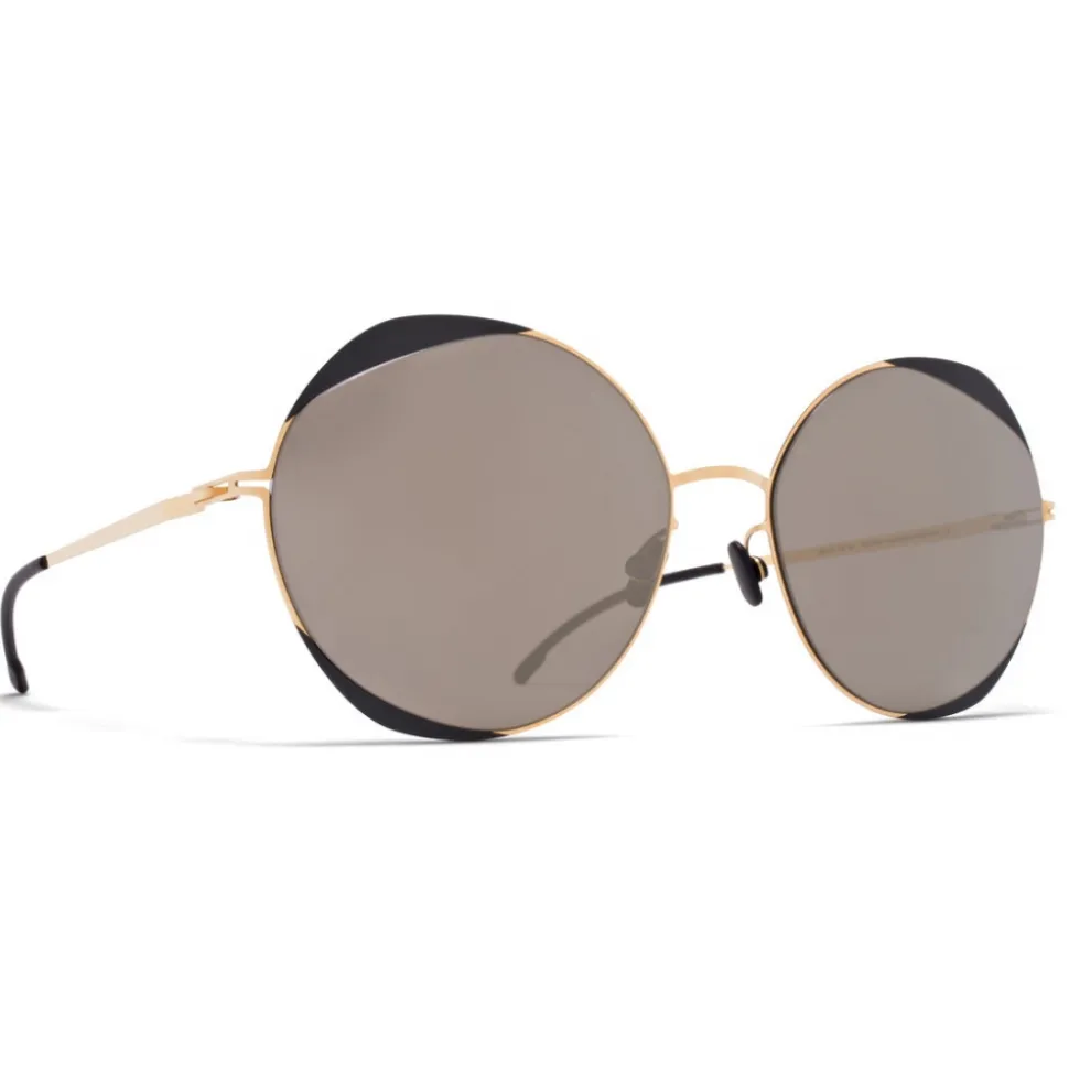 Made of lightweight stainless steel, ELISA in Gold/Jet Black with Brilliant Grey Solid lenses is a round-shaped sunglass frame from the MYKITA DECADES collection with a geometric rim design. Handcrafted in Berlin.