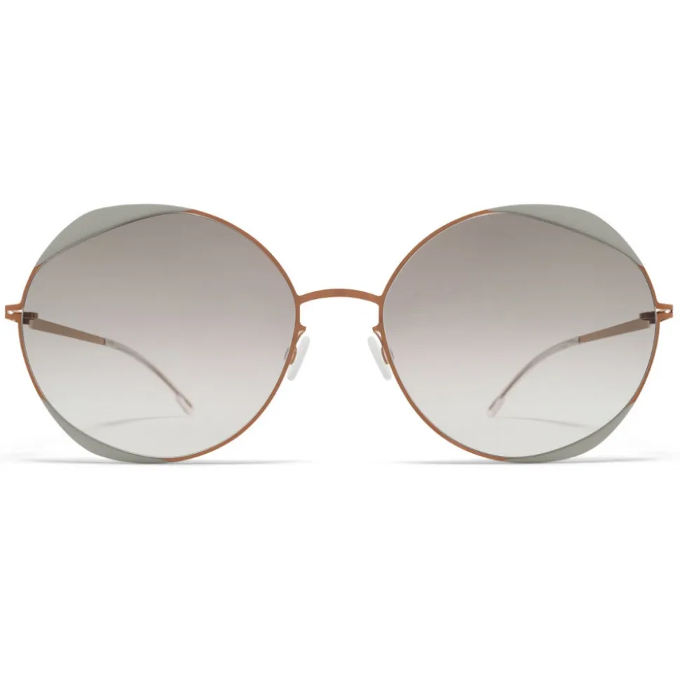 Made of lightweight stainless steel, ELISA in Shiny Copper/Stone Grey with Original Grey Gradient lenses is a round-shaped sunglass frame from the MYKITA DECADES collection with a geometric rim design. Handcrafted in Berlin.