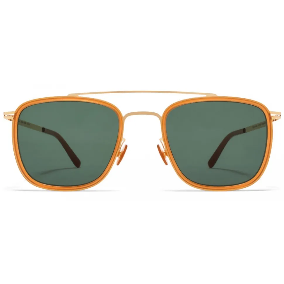 Made of lightweight stainless steel and slender acetate, HANNO in A17 Glossy Gold/Dark Amber with Dark Green Solid lenses is an aviator-shaped sunglass frame from the MYKITA LITE ACETATE collection. Handcrafted in Berlin.