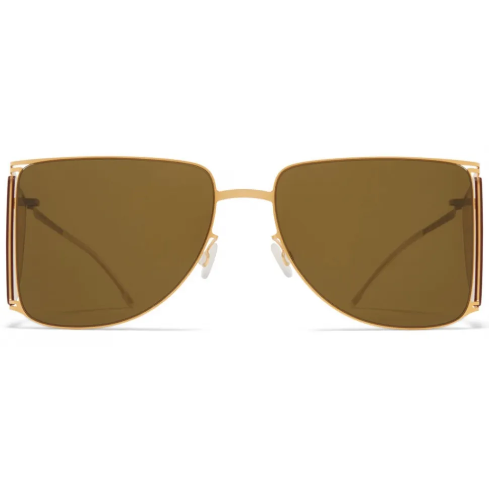 Made of lightweight stainless steel, HL002 in Frosted Gold/Jelly Yellow Sides with Raw Brown Solid/Jelly Yellow Sides lenses is an aviator-shaped four-lens sunglass frame from the MYKITA and HELMUT LANG collection. Handcrafted in Berlin.