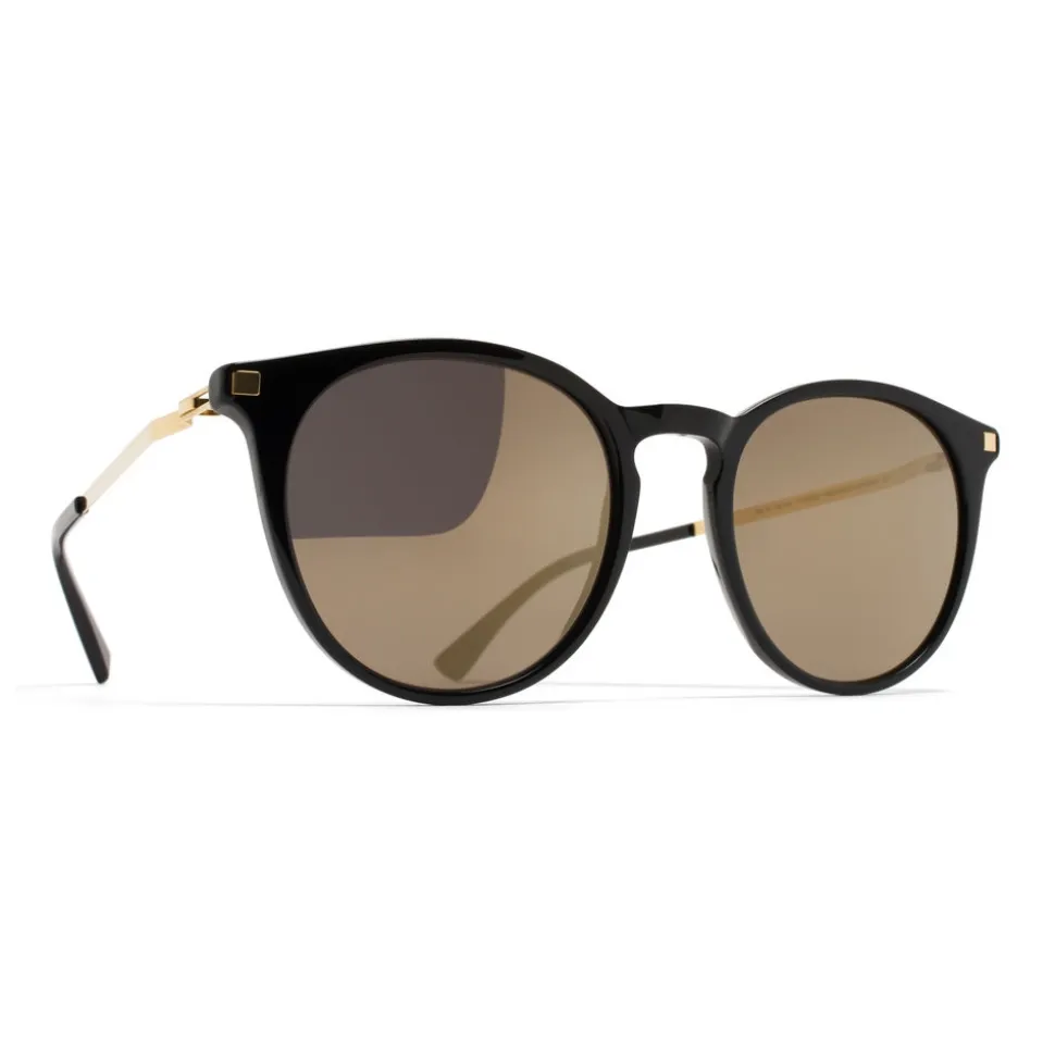 Made of lightweight stainless steel and slender acetate, KEELUT in Black/Glossy Gold with Brilliant Grey Solid lenses is a round-shaped sunglass frame from the MYKITA LITE collection. Handcrafted in Berlin.