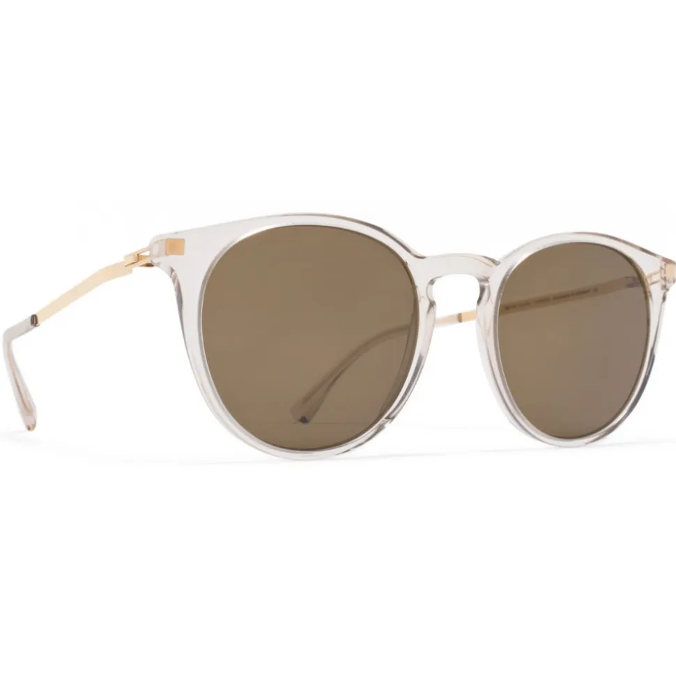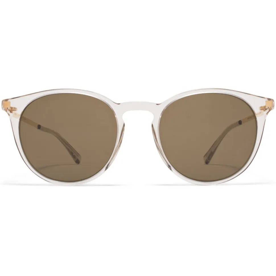 Made of lightweight stainless steel and slender acetate, KEELUT in Champagne/Glossy Gold with Raw Brown Solid lenses is a round-shaped sunglass frame from the MYKITA LITE collection. Handcrafted in Berlin.