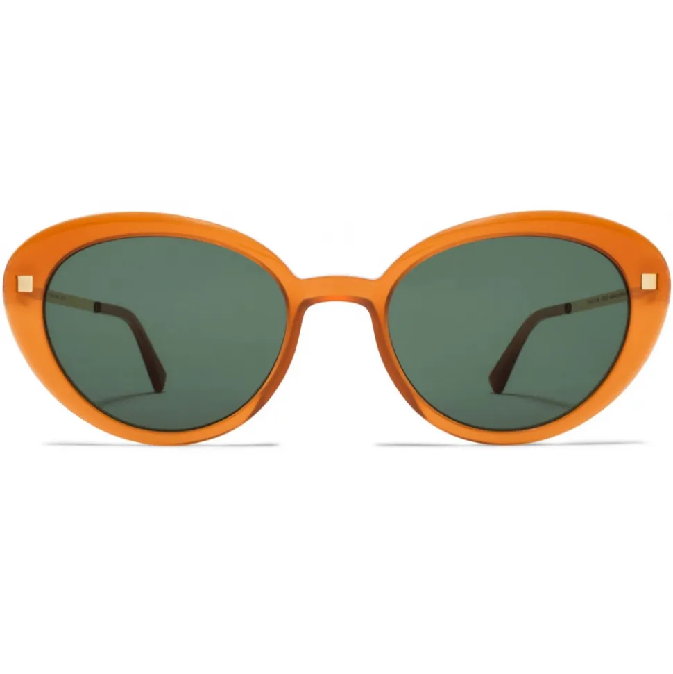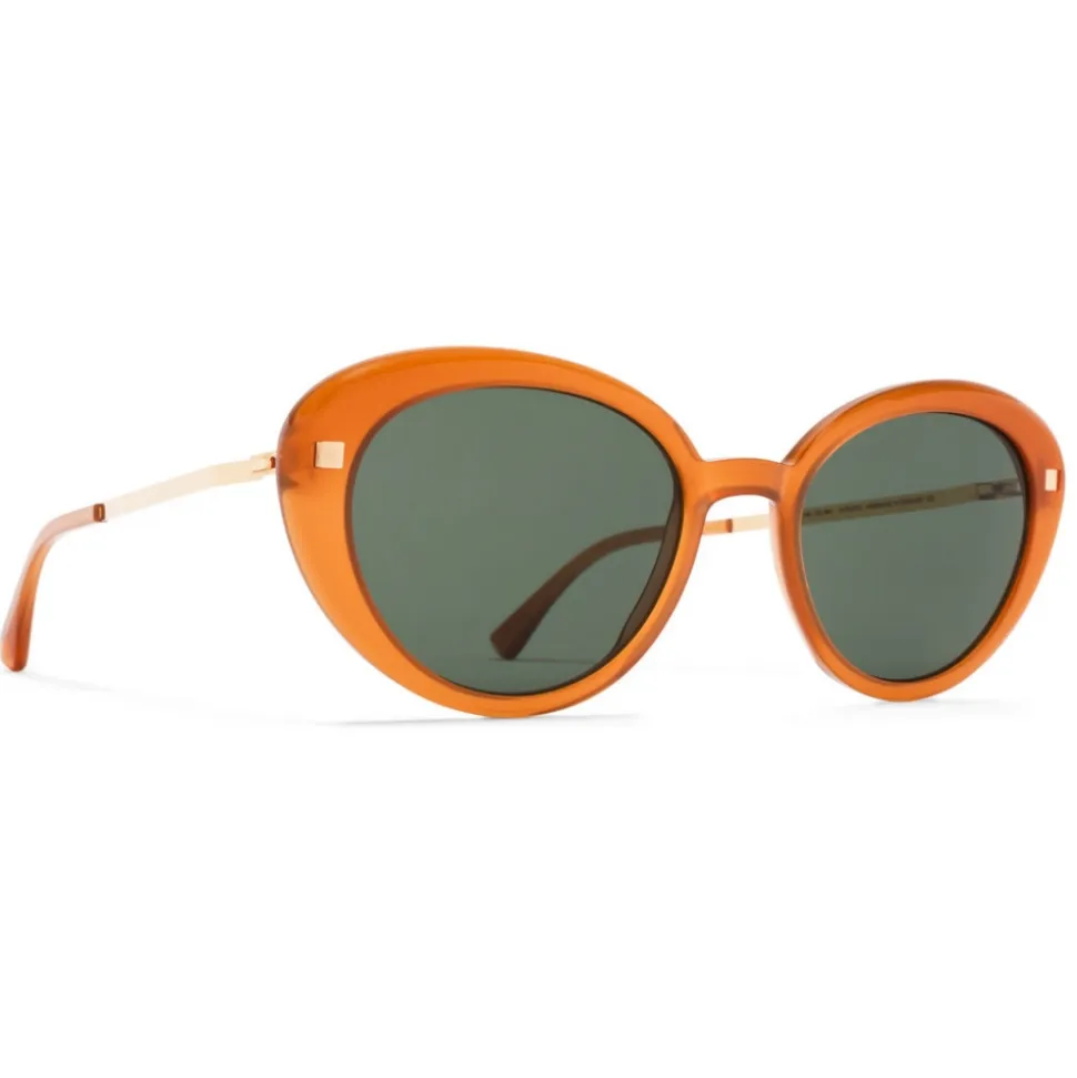 Made of lightweight stainless steel and slender acetate, LUAVA in C23 Dark Amber/Glossy Gold with Dark Green Solid lenses is a oval-shaped sunglass frame from the MYKITA LITE ACETATE collection. Handcrafted in Berlin.