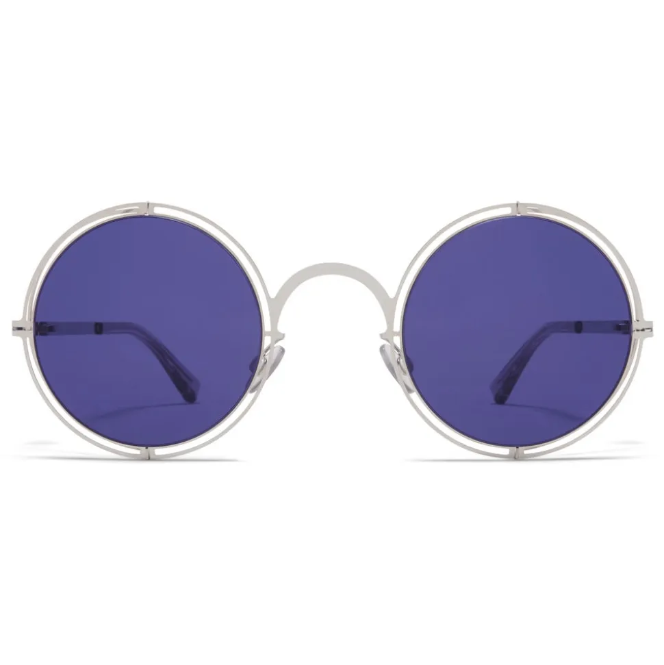 Made of lightweight stainless steel with functional details in acetate, MMCRAFT001 in Shiny Silver with Indigo Solid lenses is a round-shaped sunglass frame from the MYKITA + MAISON MARGIELA collection. Handcrafted in Berlin.