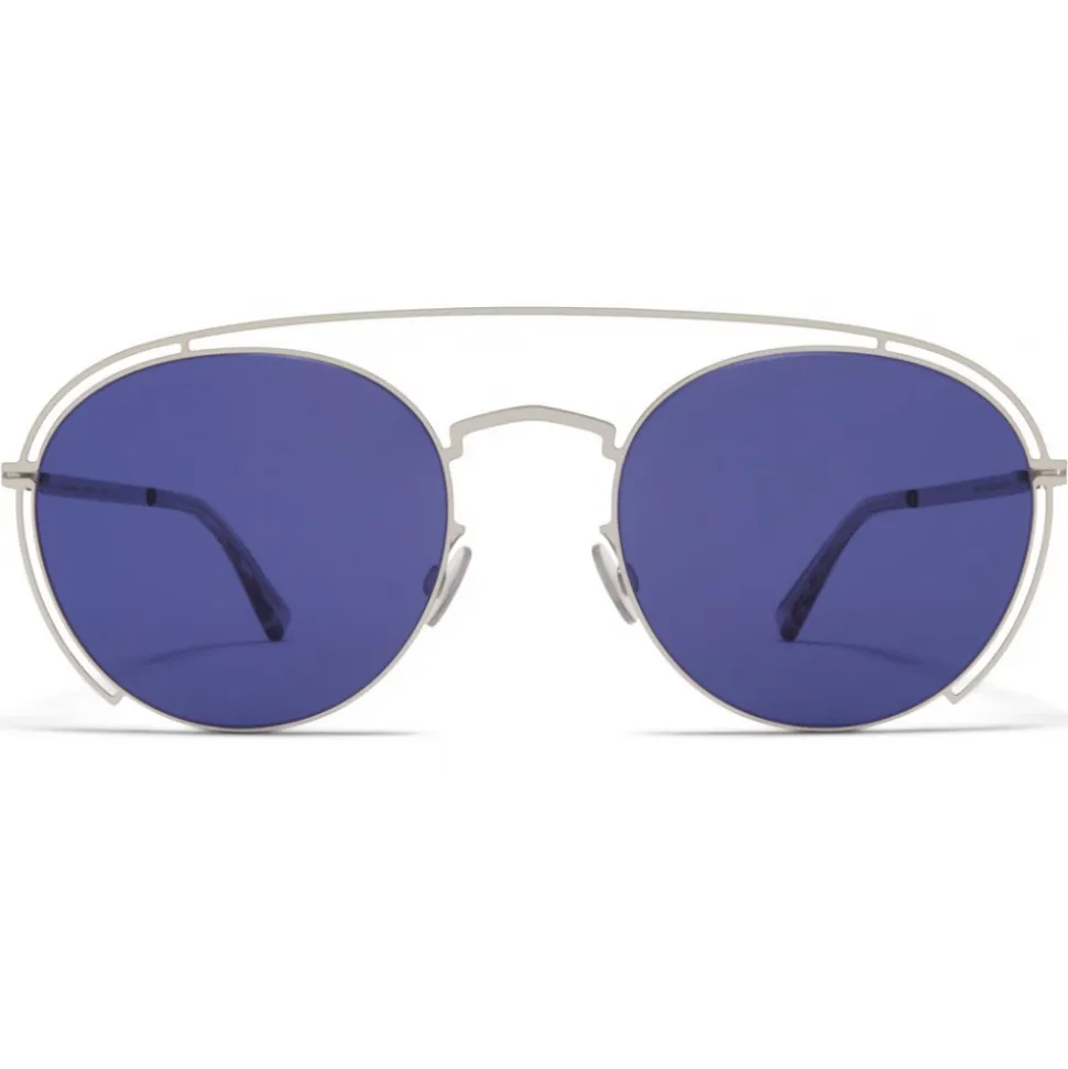 Made of lightweight stainless steel with functional details in acetate, MMCRAFT009 in Shiny Silver with Indigo Solid lenses is a panto-shaped sunglass frame from the MYKITA + MAISON MARGIELA collection. Handcrafted in Berlin.