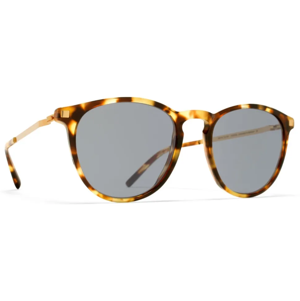 Made of lightweight stainless steel and slender acetate, NUKKA in Cocoa Sprinkles/Glossy Gold with Dark Blue Solid lenses is a panto-shaped sunglass frame from the MYKITA LITE collection. Handcrafted in Berlin.