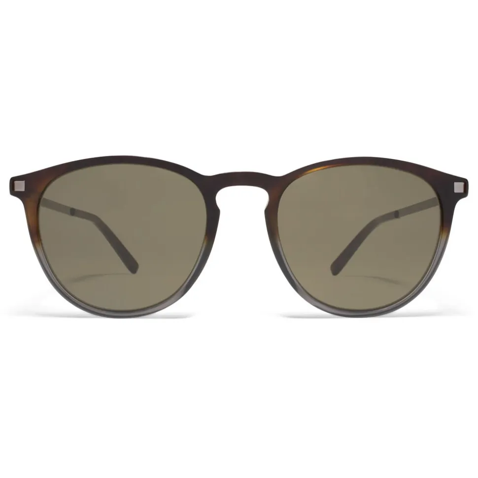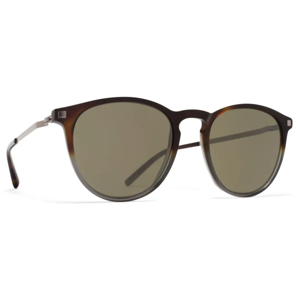 Made of lightweight stainless steel and slender acetate, NUKKA in Santiago Gradient/Shiny Graphite with Raw Green Solid lenses is a panto-shaped sunglass frame from the MYKITA LITE collection. Handcrafted in Berlin.