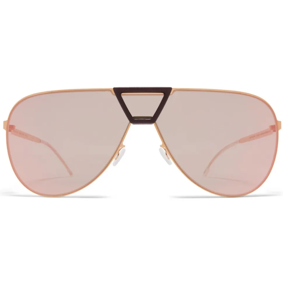 Made of MYLON – an exceptionally light and durable material – PEPPER in MH8 Ebony Brown/Champagne Gold with Champagne Gold Shield lenses is an aviator-shaped sunglass frame from the MYKITA MYLON collection. Handcrafted in Berlin.