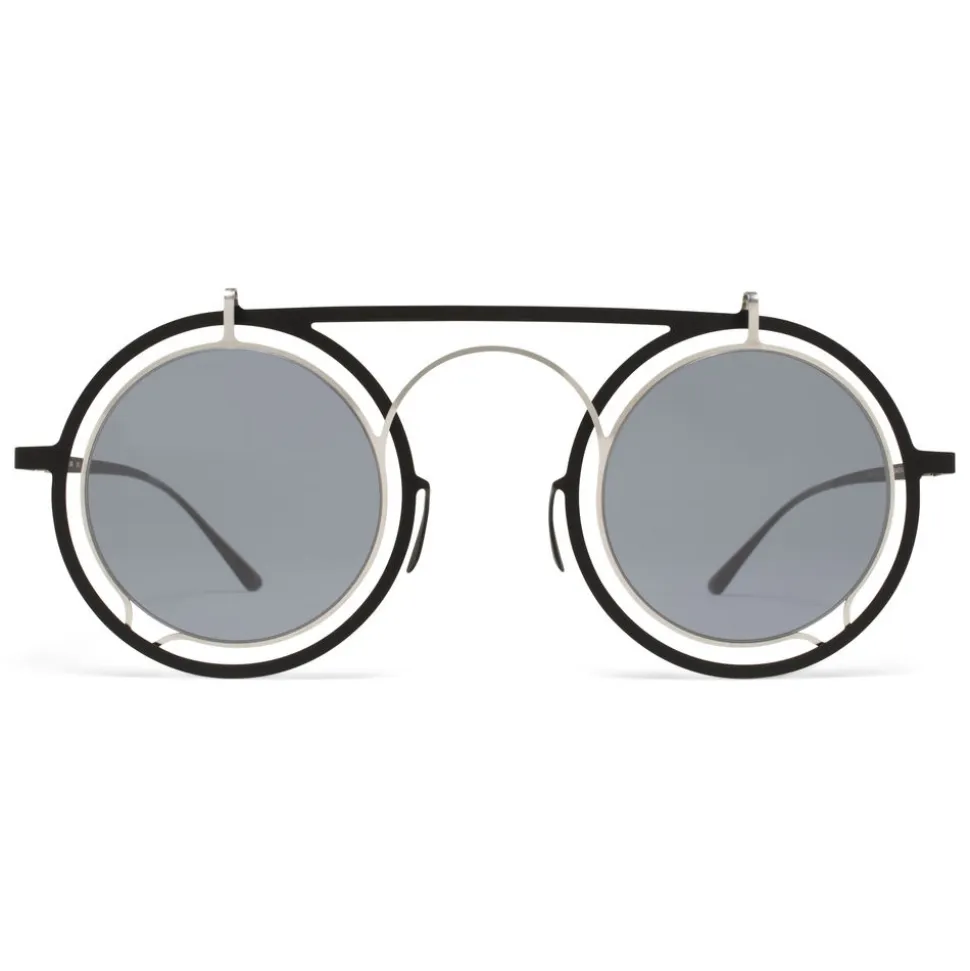 Made of lightweight stainless steel, SIRU in Silver/Black with Dark Grey Solid lenses is a round-shaped sunglass frame from the MYKITA / DAMIR DOMA collection. Handcrafted in Berlin.