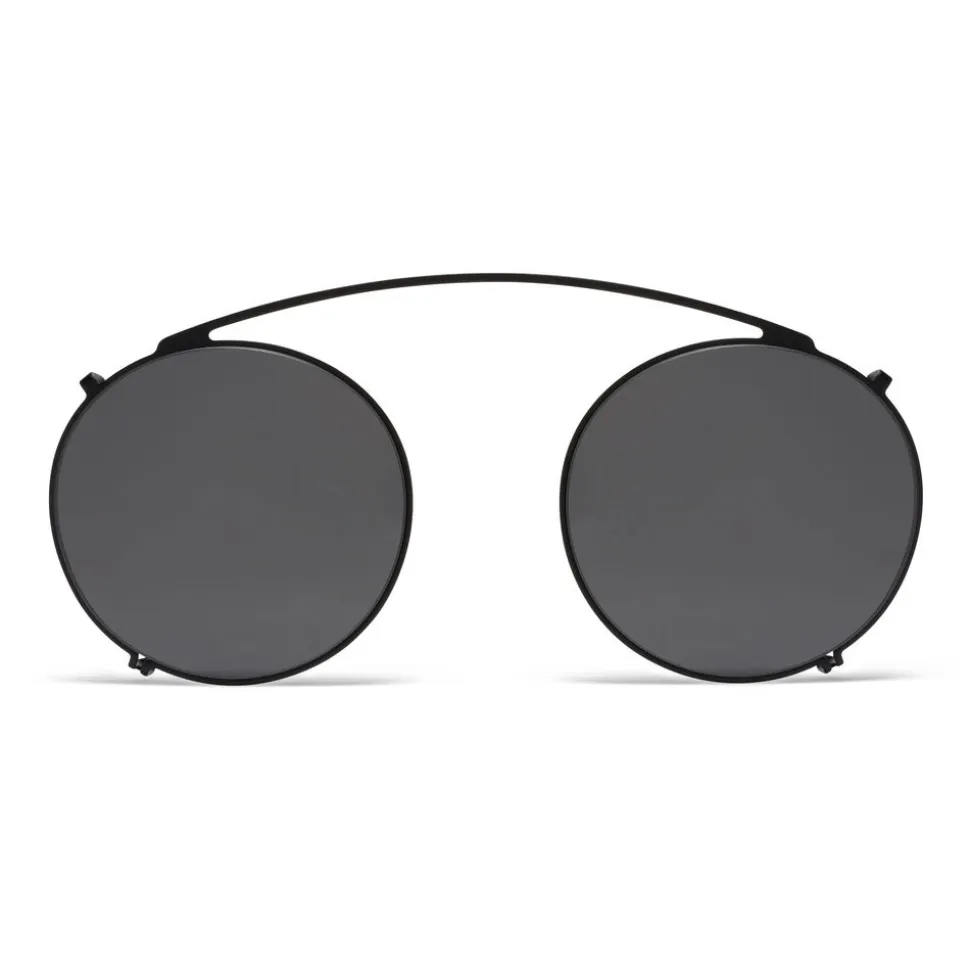 Made of ultra-light stainless steel, TOMKIN SHADES in R1 Black with Dark Grey Solid lenses is a customised clip-on that transforms the look and function of its respective MYKITA actetate frame. Handcrafted in Berlin.
