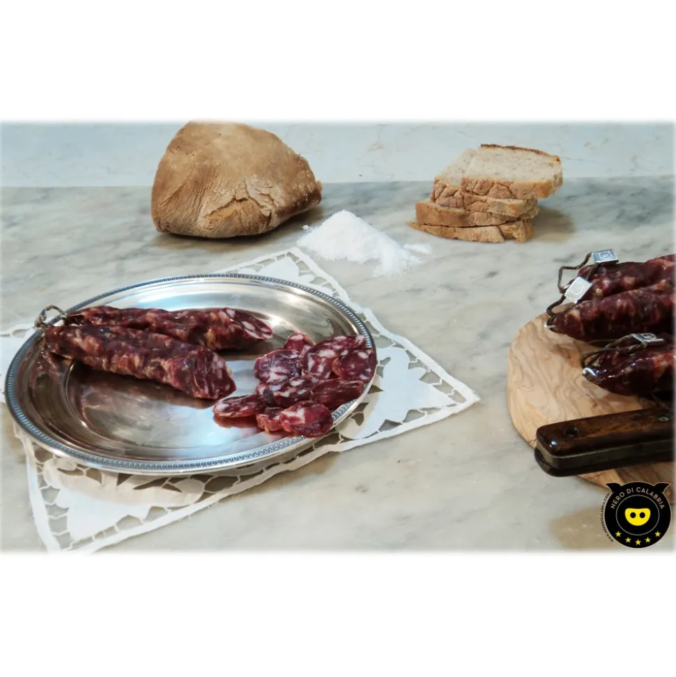 The Nero di Calabria sausage is a sausage obtained from shoulder and rib cuts. It is processed by hand, with a knife cut, in order to avoid an increase in temperature of the raw material that would deteriorate its fine organoleptic qualities.