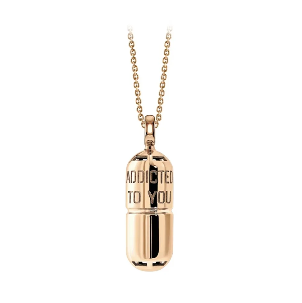 PILL.OLA is jewel therapy. A luxurious treatment capable of altering your state, thanks to the active ingredients of gold and diamonds. The message “ADDICTED TO YOU” represents an offbeat prescription for your radiant well-being.