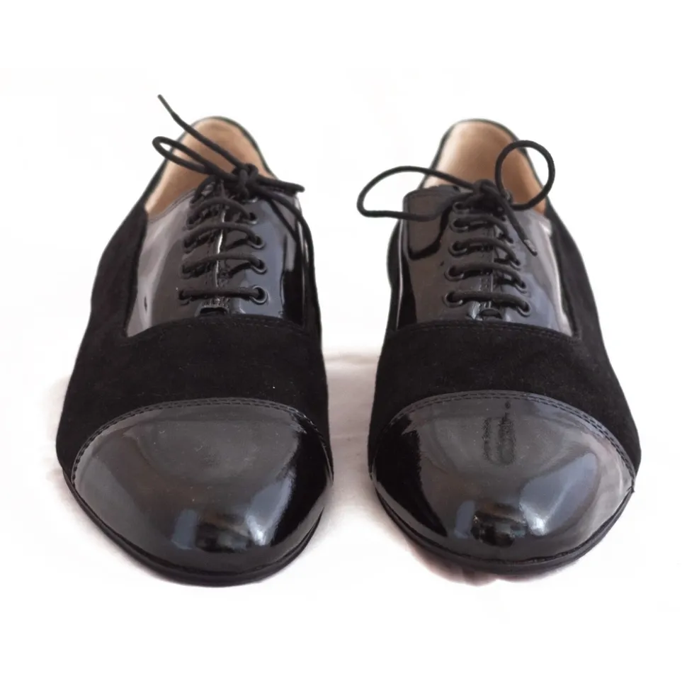 Elegant handcrafted shoe for men’s evening in black patent leather and suede.