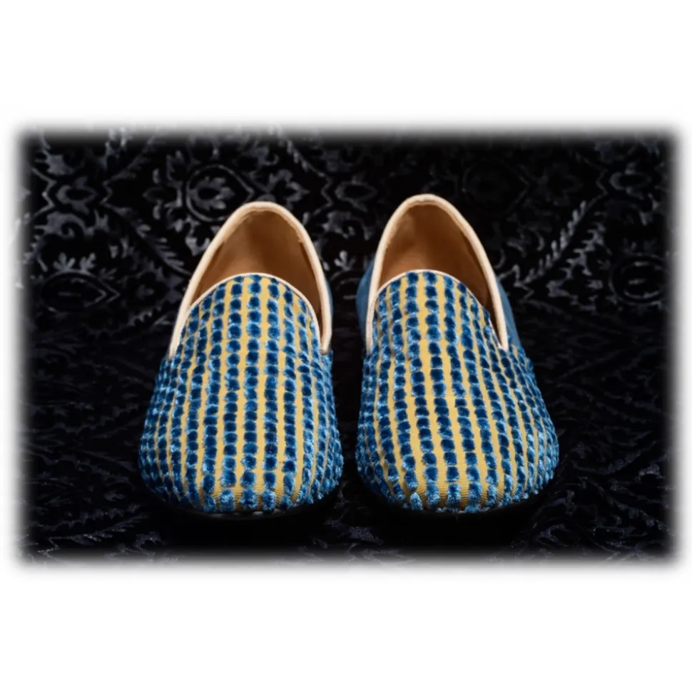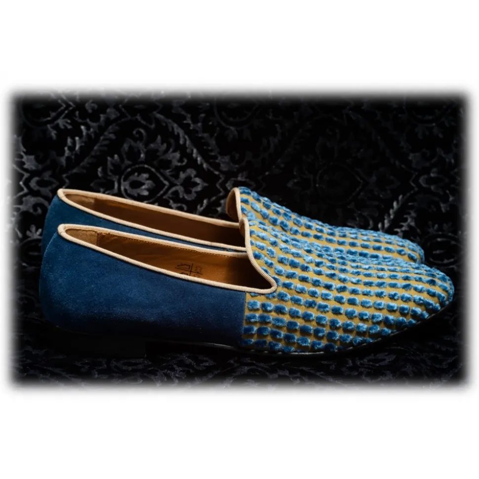 Nicolao Atelier – Silk Velvet Slipper Shoe – Light Blue Checkered Pattern on Gold Background Man – Shoe – Made in Italy – Luxury Exclusive Collection