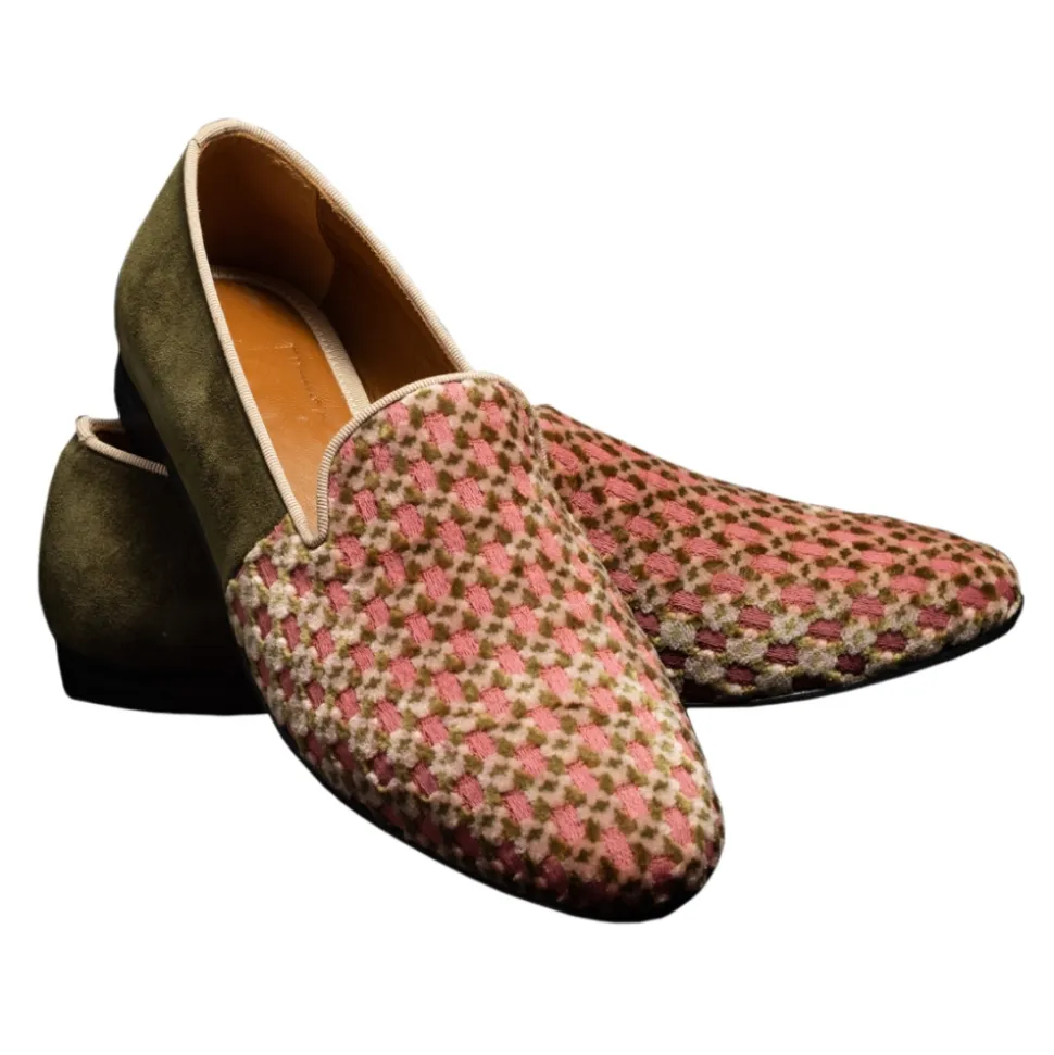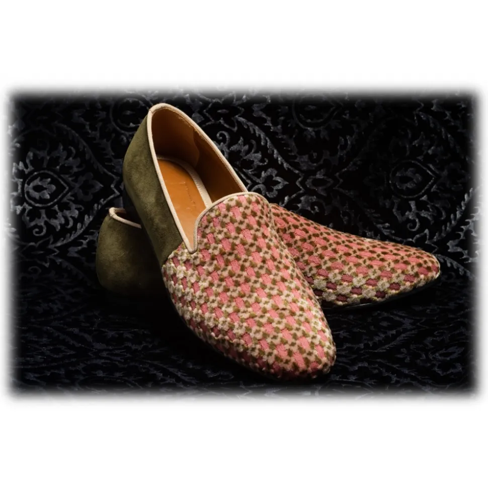 Nicolao Atelier – Slipper in Shaved Silk Velvet – Color Pink Moss Green and Beige Diamond Pattern Man – Shoe – Made in Italy – Luxury Exclusive Collection