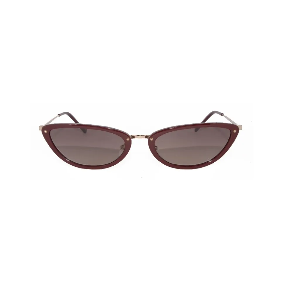 The lenses are triangular in shape. The first proposal is the elegant model finished with a transparent gold and pink frame and pink lenses. The second proposal is the chic model with shaded blue lenses, the frame is transparent gray with golden metal terminals. Another model is the elegant version with dark green lenses and brown frame with gold terminals. The latest proposal is the classic with bordeaux frame, gold terminals and brown lenses.