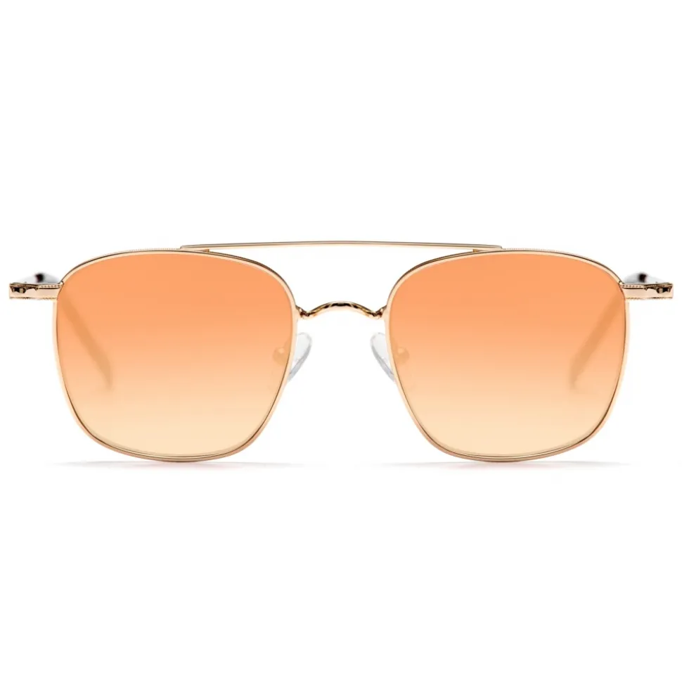Rectangular metal sunglasses with double bridge. New No Logo Eyewear model, discover the enveloping line of the 81013 rectangular model ideal for both him and her. The glasses are available in three color variants, blue lens, mirrored orange and bottle green.