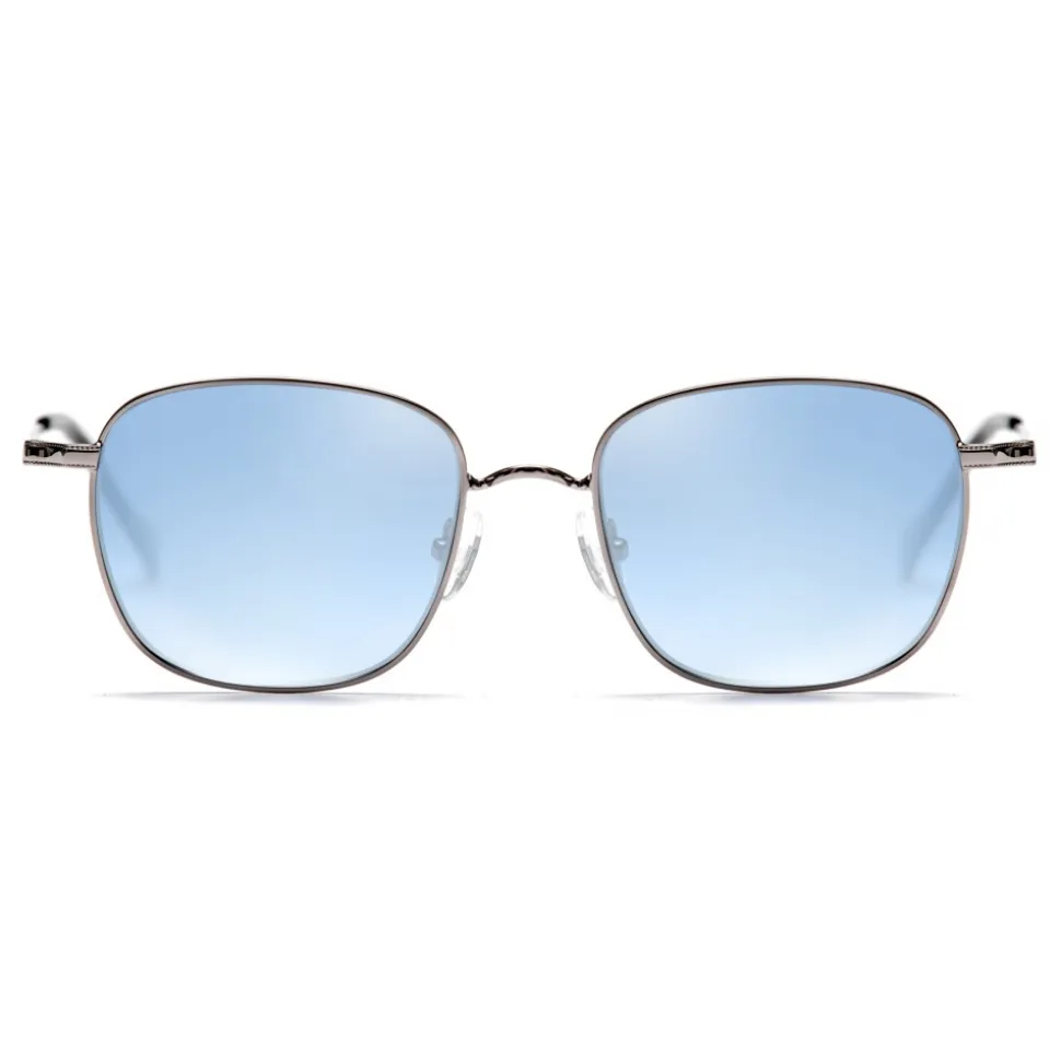 Rectangular sunglasses. New No Logo Eyewear model, discover the enveloping line of the 81016 rectangular model ideal for both him and her. The glasses are available in three color variants, blue mirrored lens, gold mirror and polarized black smoke.