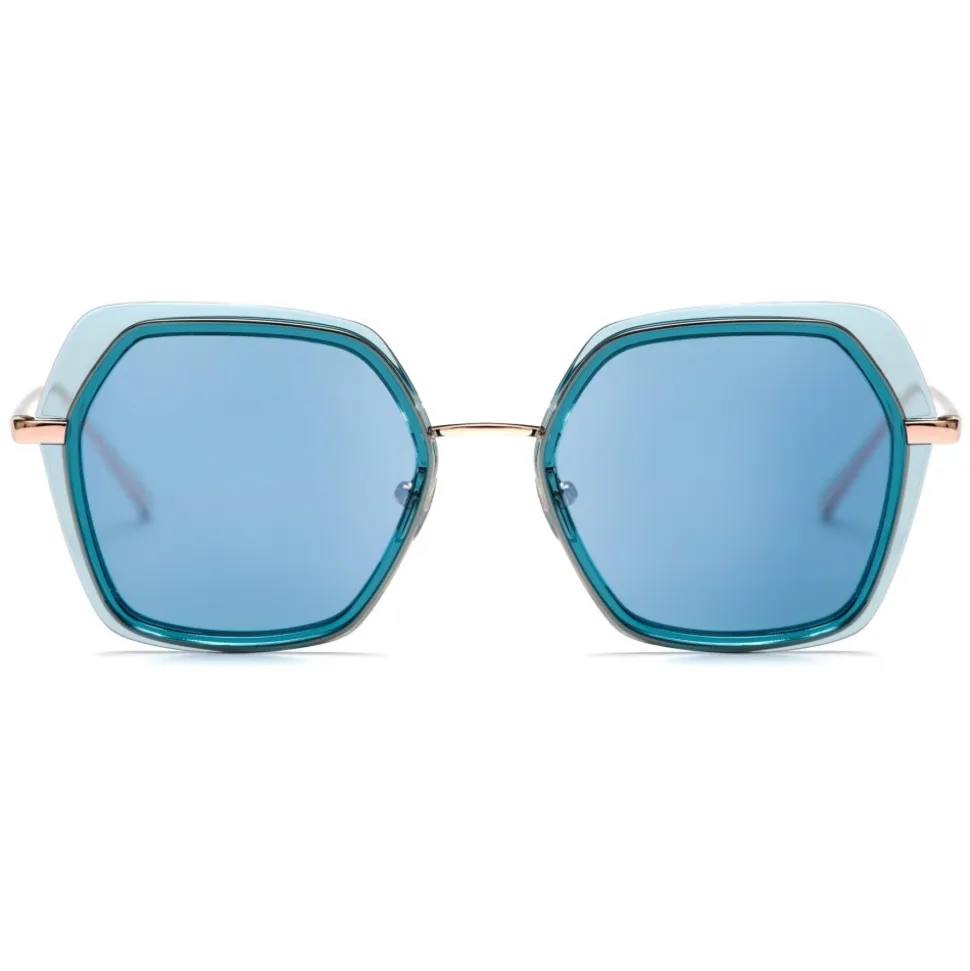 Hexagonal vintage sunglasses model 81030. New No Logo model available in four beautiful colors all with polarized lenses. Discover this model revisited in the style of the 70s. A modern reinterpretation in vintage style available in black, tortoiseshell and with blue and pink lenses. The frame is in metal finished with terminals and circles in acetate combined with the lenses.