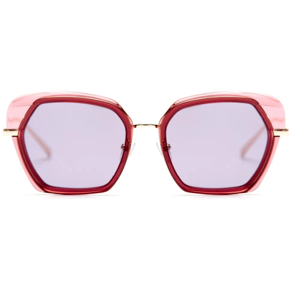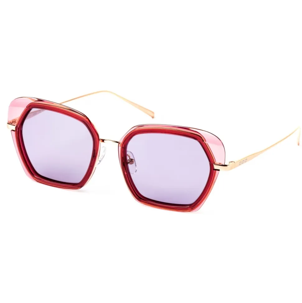 Hexagonal butterfly sunglasses model 81045. New No Logo model available in three elegant colors, all with polarized lenses. The frame is in gold metal finished with terminals and circles in acetate combined with the lenses. Models with pink and blue lenses are available with mirrored lenses.