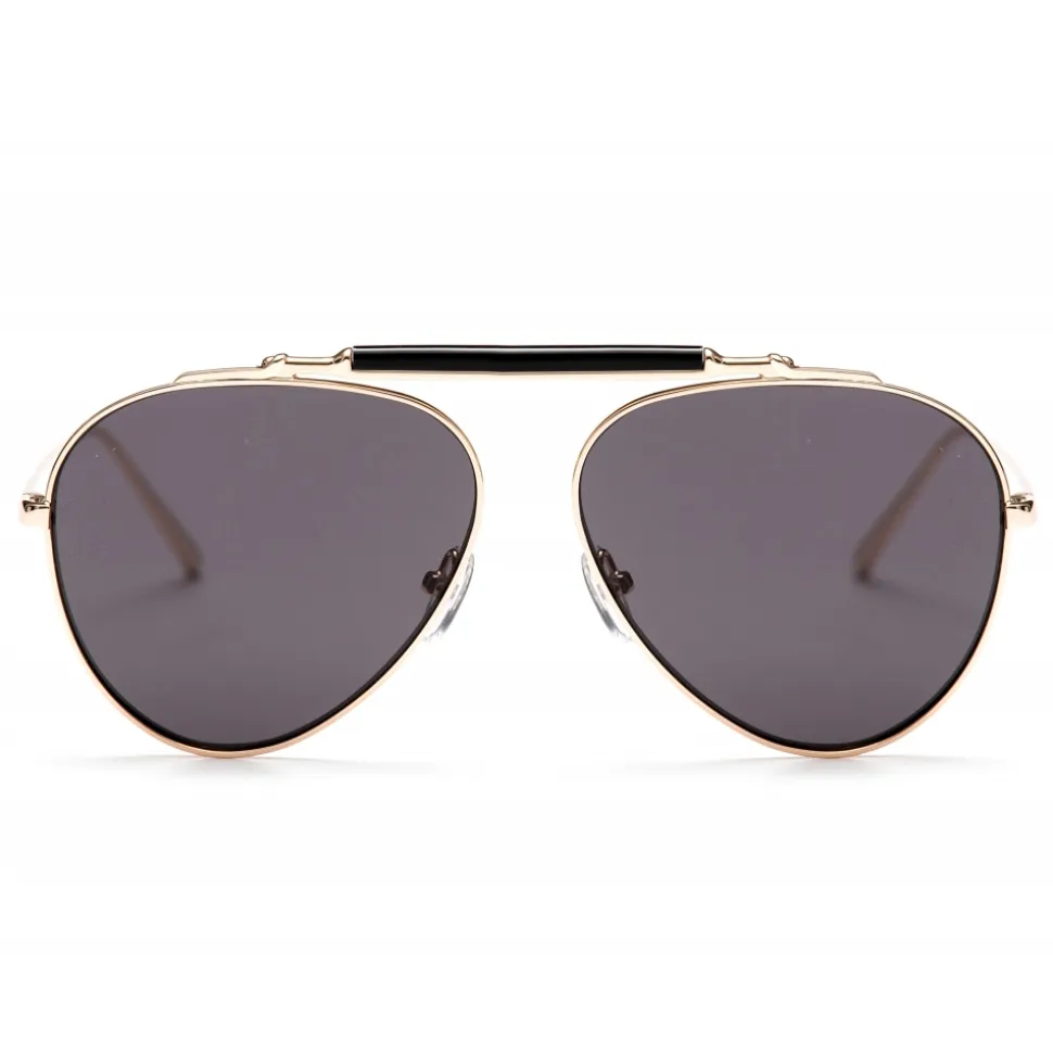 The model is available in 6 color variants. The first proposal is the model with an hour frame and shaded gold mirrored lenses. The second model has the frame in now with smoke black lenses. The third proposal is the model with blue mirrored lenses and gold frame. The fourth model features shaded silver mirrored lenses with a gunmetal frame. The fifth proposal has a gunmetal frame and brown lenses. The last proposal is fitted with mirrored gold lenses with a gold metal frame.