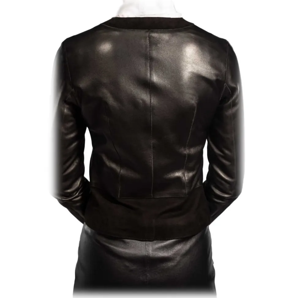 Nichia de noblesse oblige is simply chic. its short cut and its darts integrated into the pockets cinch the jacket to outline the silhouette. its bi-material texture in lambskin and nubuck gives a material contrast with a discreet aesthetic. Its noble materials are easy to wear and are chosen to last.