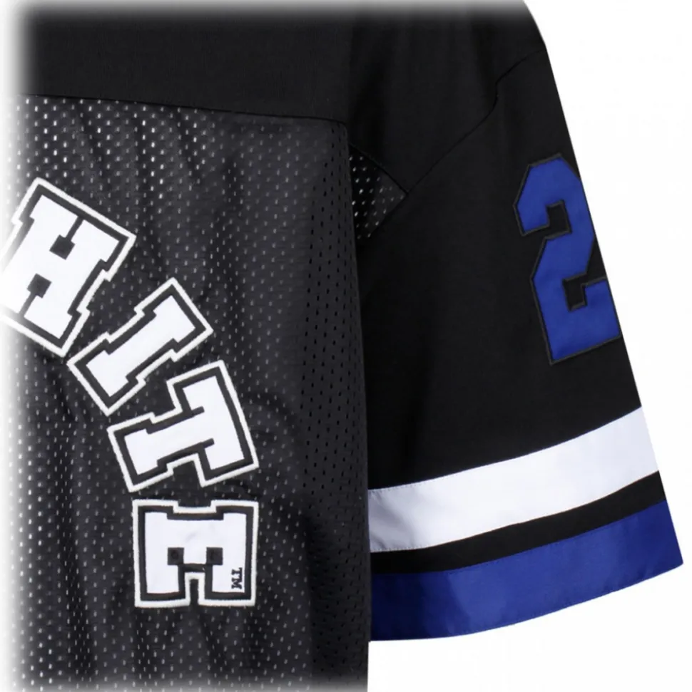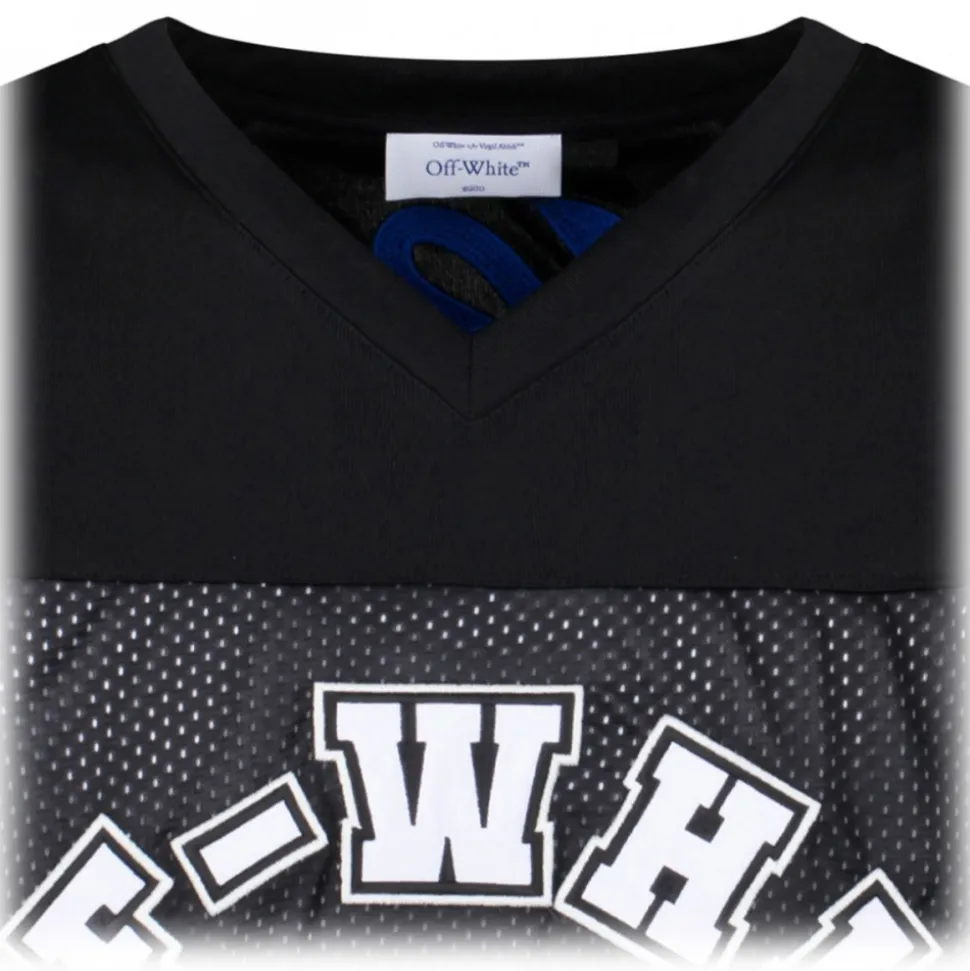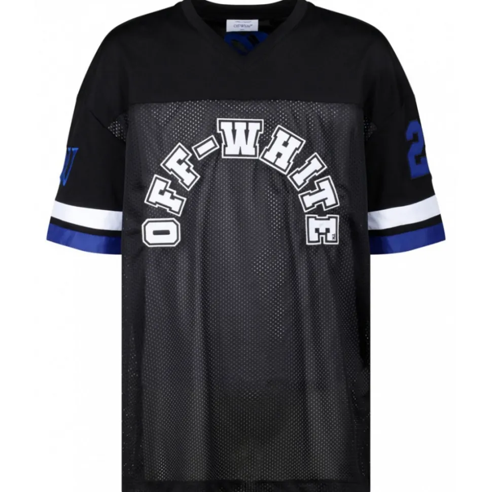 Off White Black, White and Royal Blue T-Shirt. Black, white and royal blue jersey texture t-shirt, mesh panelling, V neck