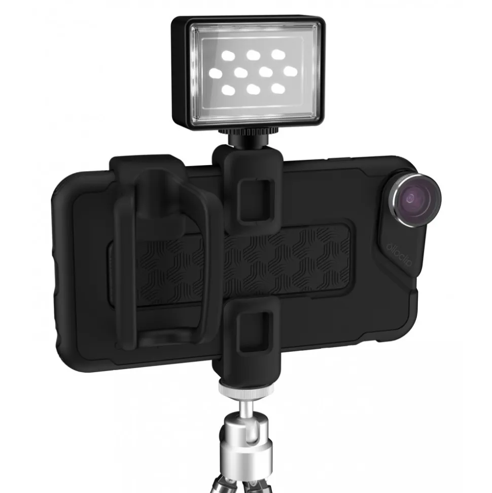 Cold-Shoe Adapters to attach lightweight accessories, like a microphone or light, in a snap. The shoe was designed to offset the center of gravity of the accessory, so it’s directly in line with the iPhone’s centerline, thus creating a more balanced experience when attaching multiple accessories.