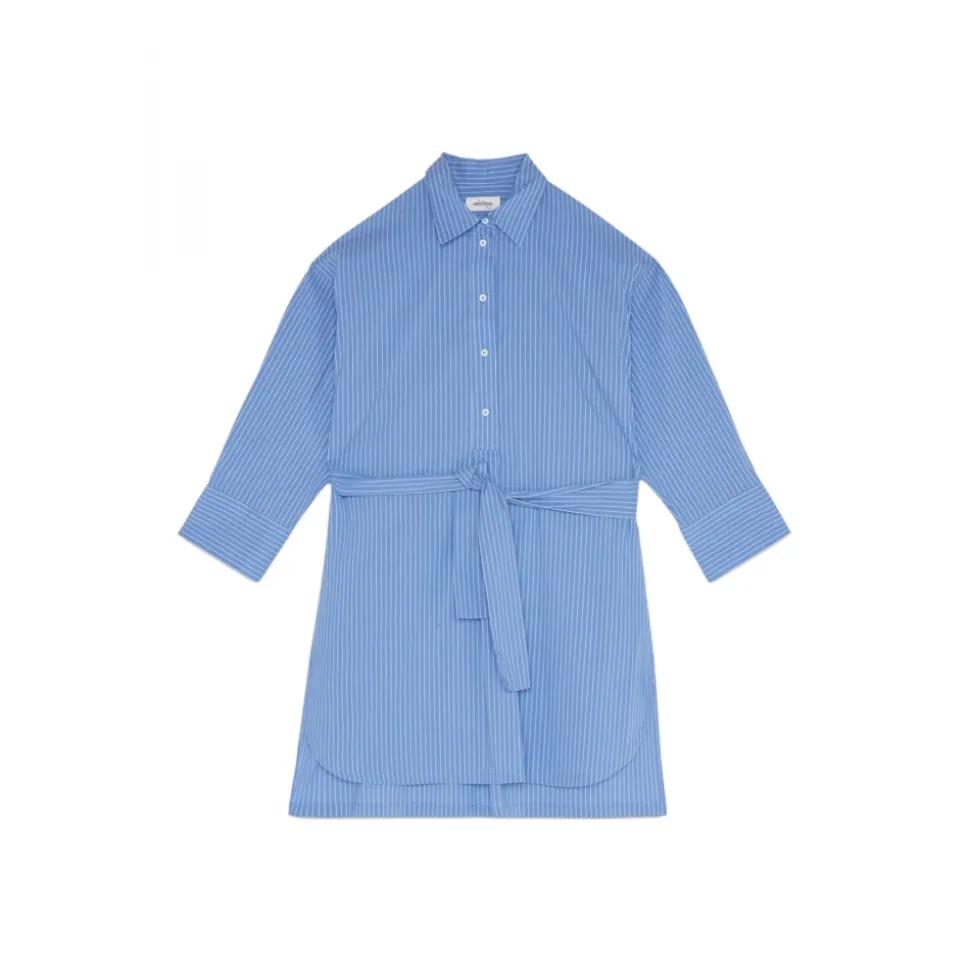 Ottod’Ame dress, oversized, long-sleeved, shirt collar with half button placket, fabric belt, in pinstripe cotton in contrasting colour.