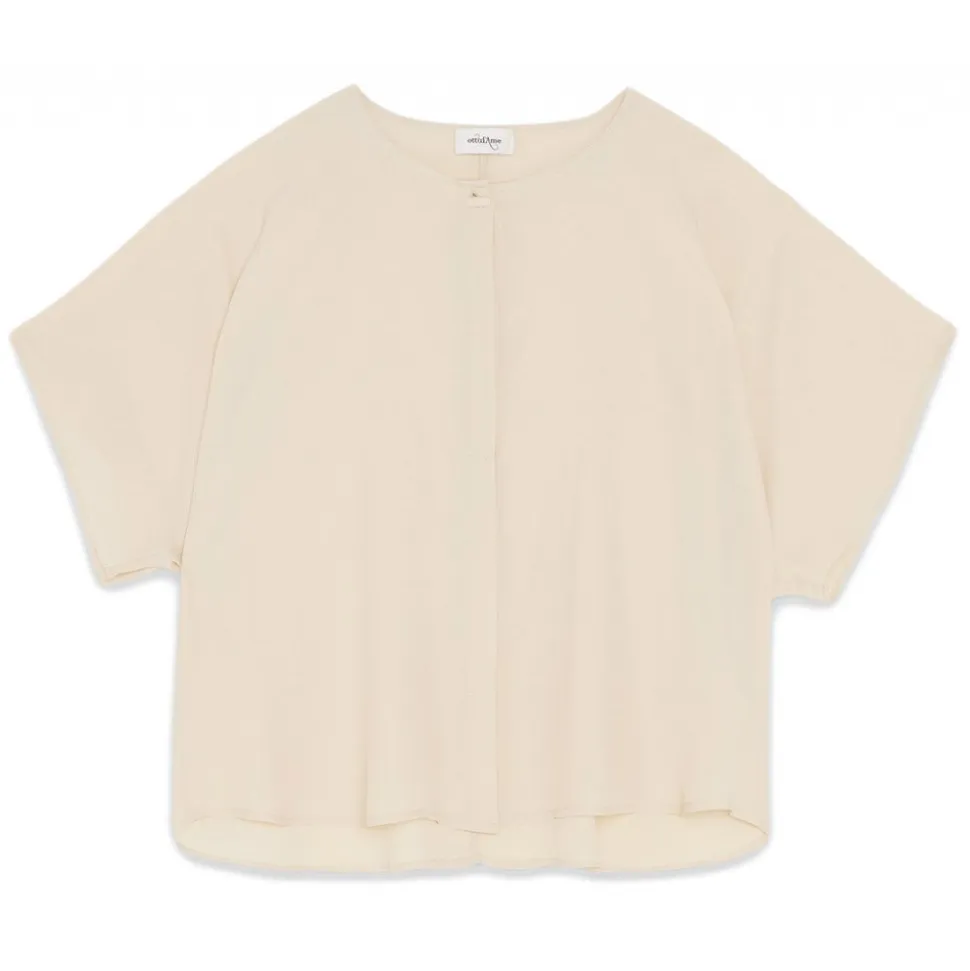 Ottod’Ame blouse, wide box-cut model, collarless, with short raglan sleeves, covered central fastening buttons, in light, slippery fabric.