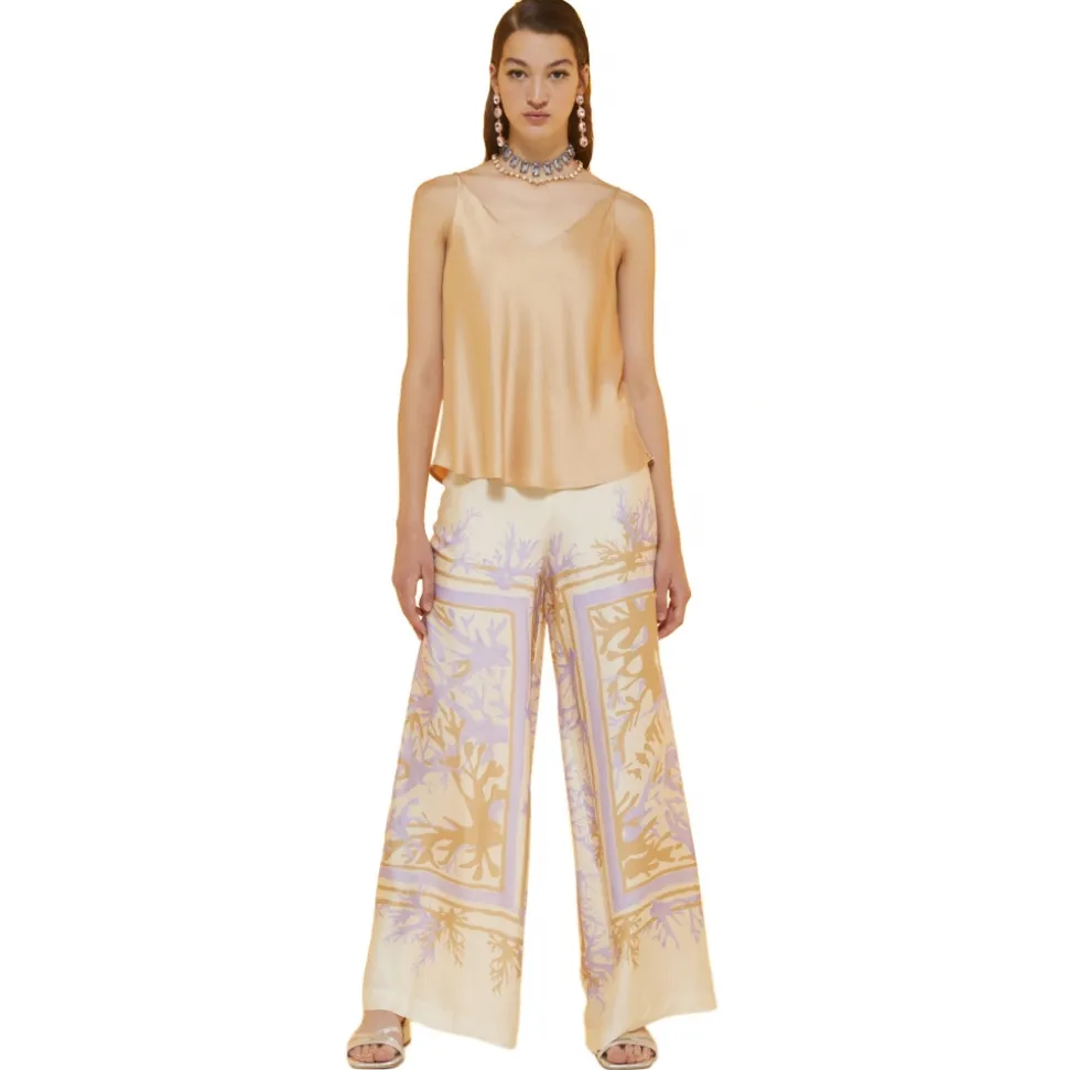 Ottod’Ame trousers, high-waisted model with strap, zip fastening on the side, very wide leg, in satin viscose, floral pattern with contrasting colour.
