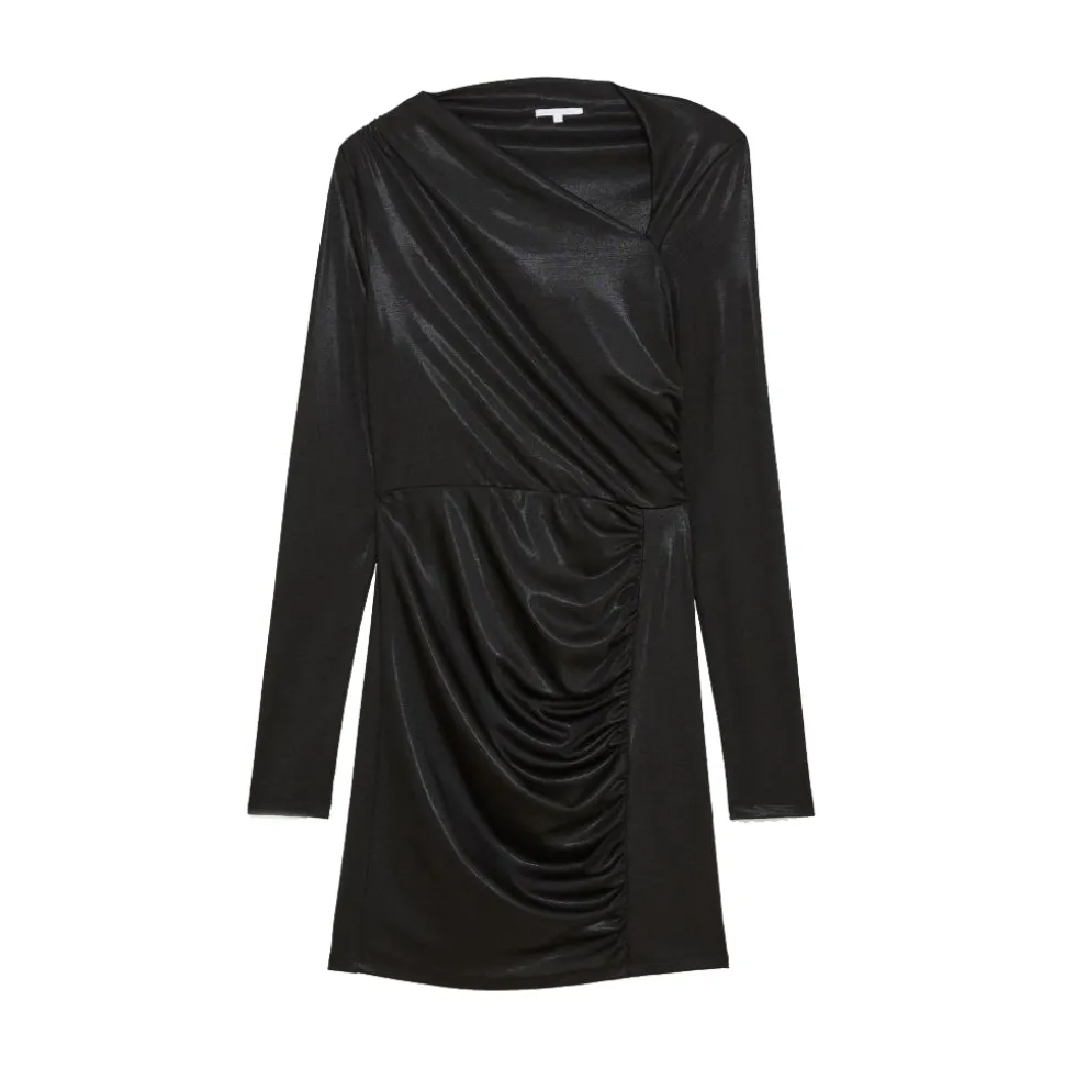 Patrizia Pepe dress with long-sleeve, asymmetrical collar, draped skirt, in shiny stretch fabric.