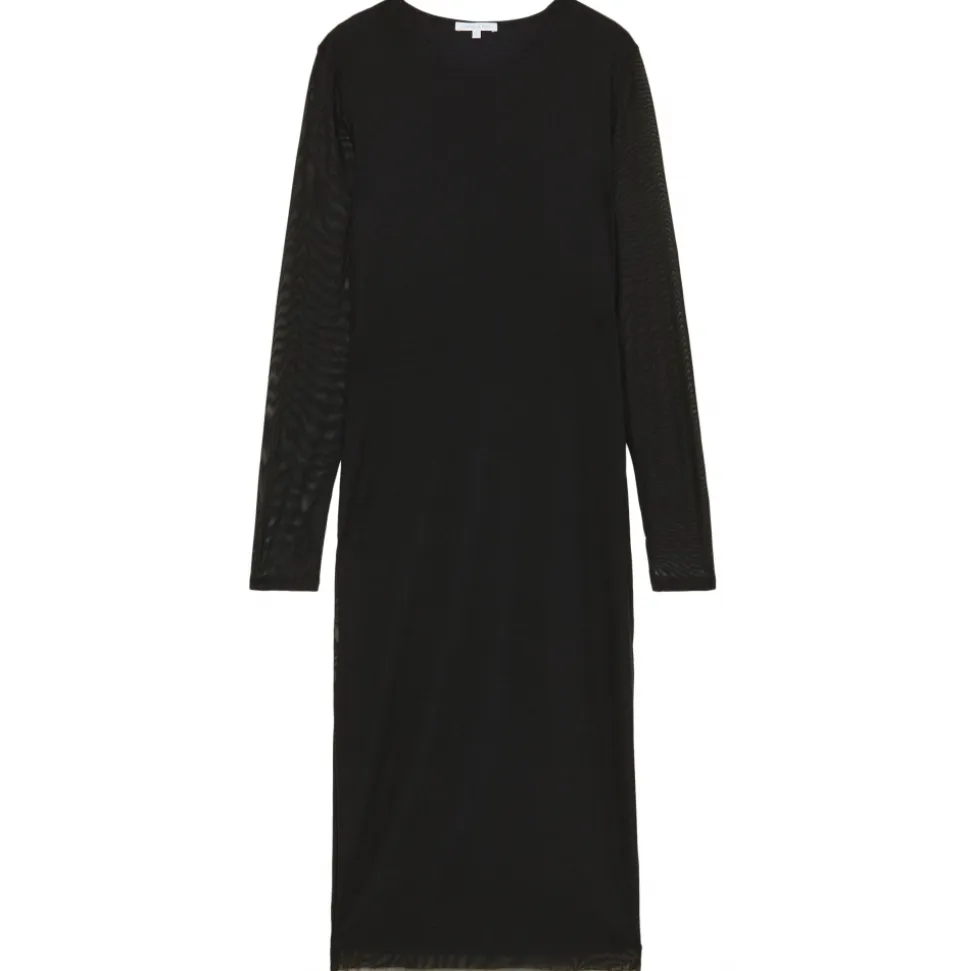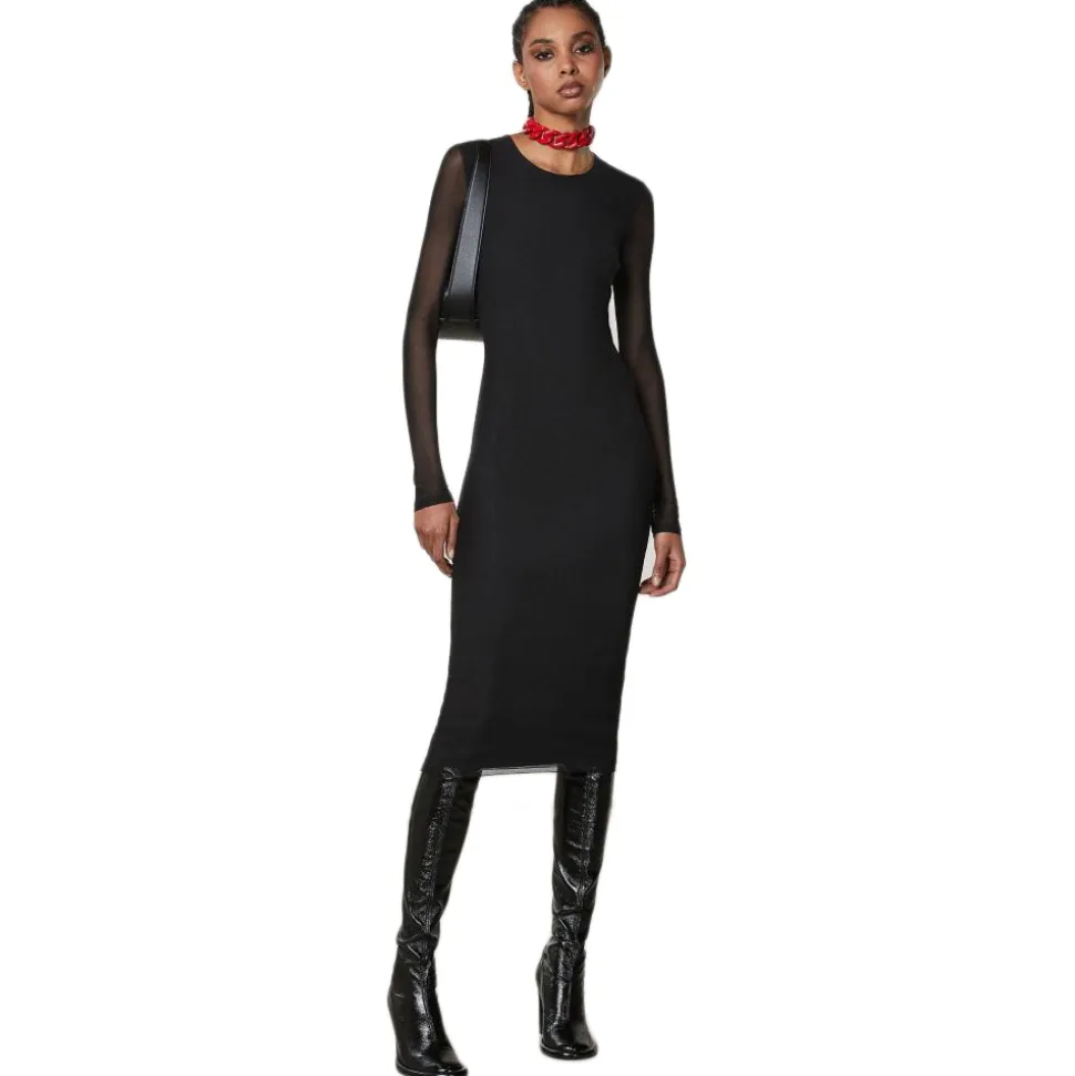 Patrizia Pepe sheath dress with round neck, long sleeve, midi length, in tulle with transparent sleeves.