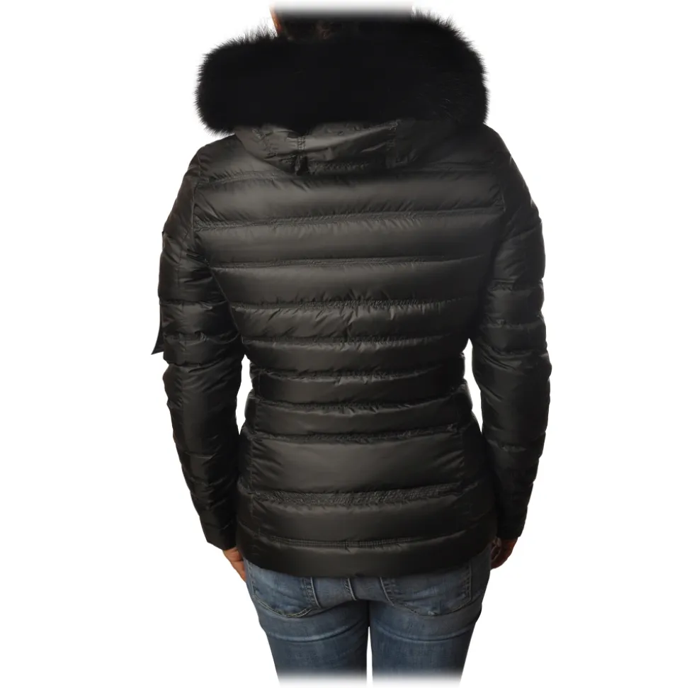 Peuterey jacket, Bell model, screwed model with zip closure, stitched fabric, with fixed hood finished with removable real fur, two concealed pockets, feather padding.